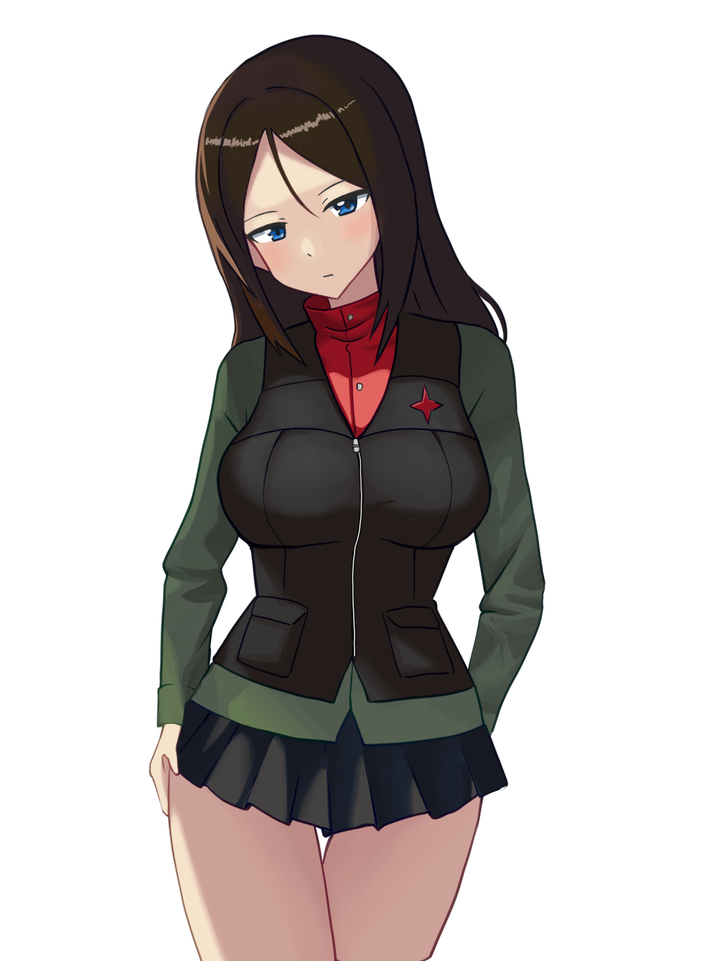 1girl black_skirt black_vest blue_eyes breasts brown_hair closed_mouth commentary_request cowboy_shot girls_und_panzer green_shirt highres large_breasts long_hair long_sleeves military_uniform miniskirt nonna_(girls_und_panzer) pleated_skirt pravda_military_uniform sesese_mimi shirt simple_background skirt solo standing thighs vest white_background