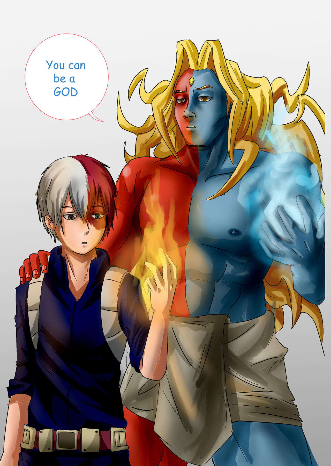 2boys belt black_eyes blonde_hair blue_eyes blue_skin boku_no_hero_academia capcom colored_skin crossover cryokinesis english_text fire forehead_jewel gill_(street_fighter) hair_between_eyes hand_on_another's_shoulder hero_outfit_(mha) heterochromia ice male_focus matching_hair/eyes multicolored_hair multicolored_skin multiple_boys muscular muscular_male pectorals pyrokinesis red_hair red_skin scar scar_on_face speech_bubble split-color_hair street_fighter street_fighter_iii_(series) superhero_costume todoroki_shoto trait_connection two-tone_hair two-tone_skin white_background white_hair yellow_eyes