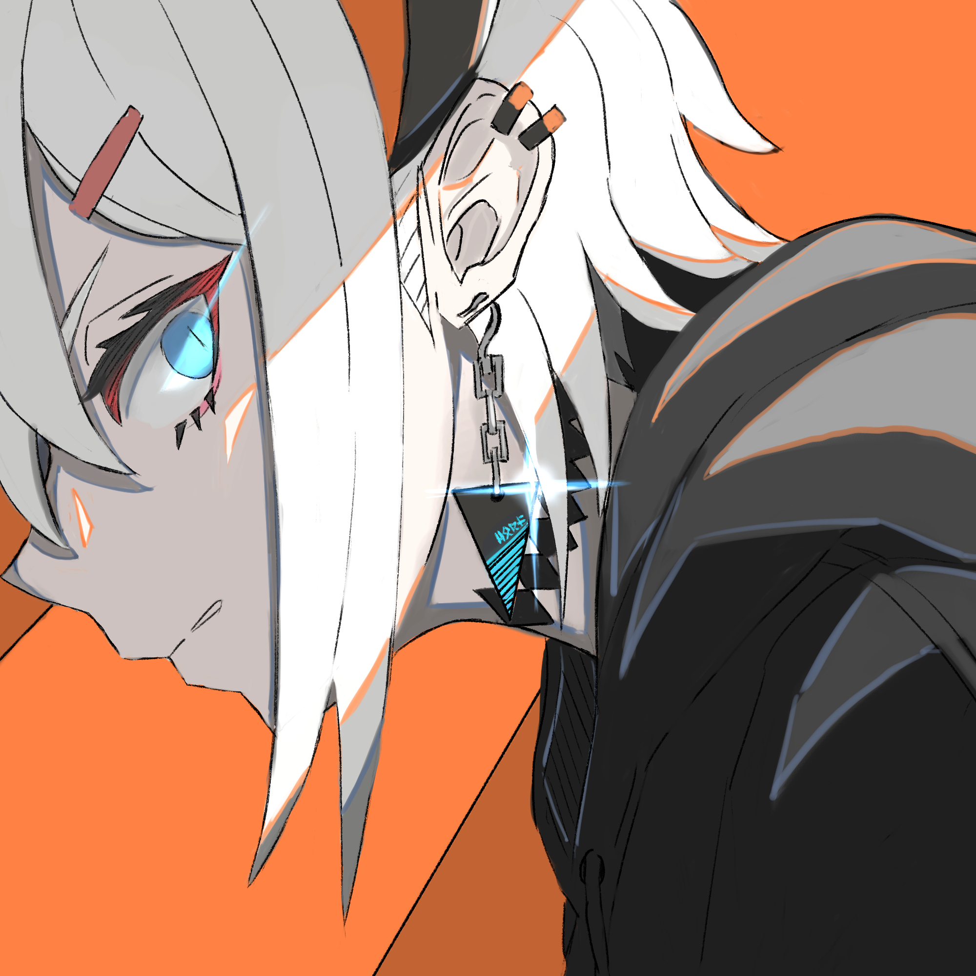 1girl black_choker blue_eyes choker commentary_request hair_between_eyes hair_ornament hairclip highres horns levi_elipha looking_at_viewer nijisanji orange_background portrait short_hair simple_background solo virtual_youtuber white_hair yukiharuorent