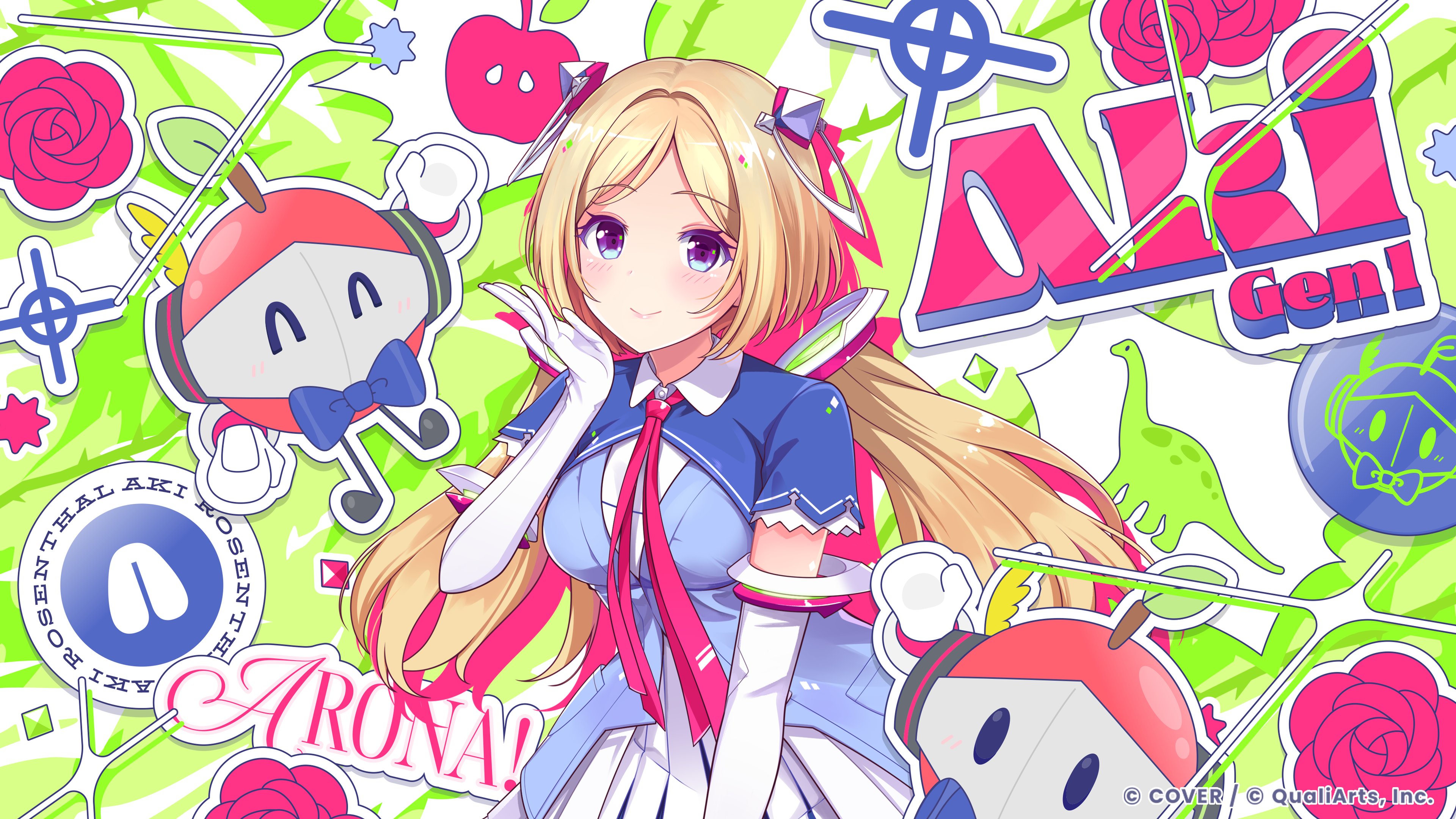 1girl ^_^ absurdres aki_rosenthal aki_rosenthal_(1st_costume) apple blonde_hair blue_dress blush character_name closed_eyes closed_mouth collared_dress commentary_request company_name copyright_notice naturally_detached_hair dress flower food fruit gloves highres hololive hololive_dreams long_hair looking_at_viewer official_art outline purple_eyes rose rosen-tai smile solo stegosaurus twintails virtual_youtuber white_gloves white_outline