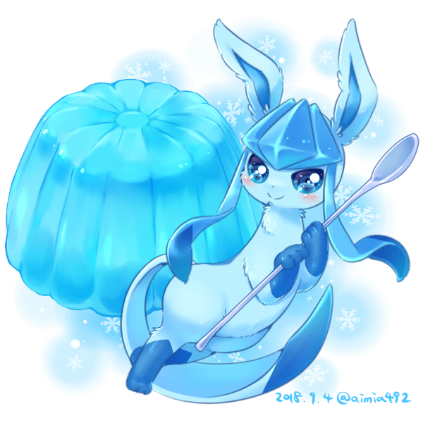 aimi_(aimia492) blue_eyes blush closed_mouth commentary_request dated food gelatin gen_4_pokemon glaceon holding nintendo no_humans pokemon pokemon_(creature) smile snowflakes spoon twitter_username