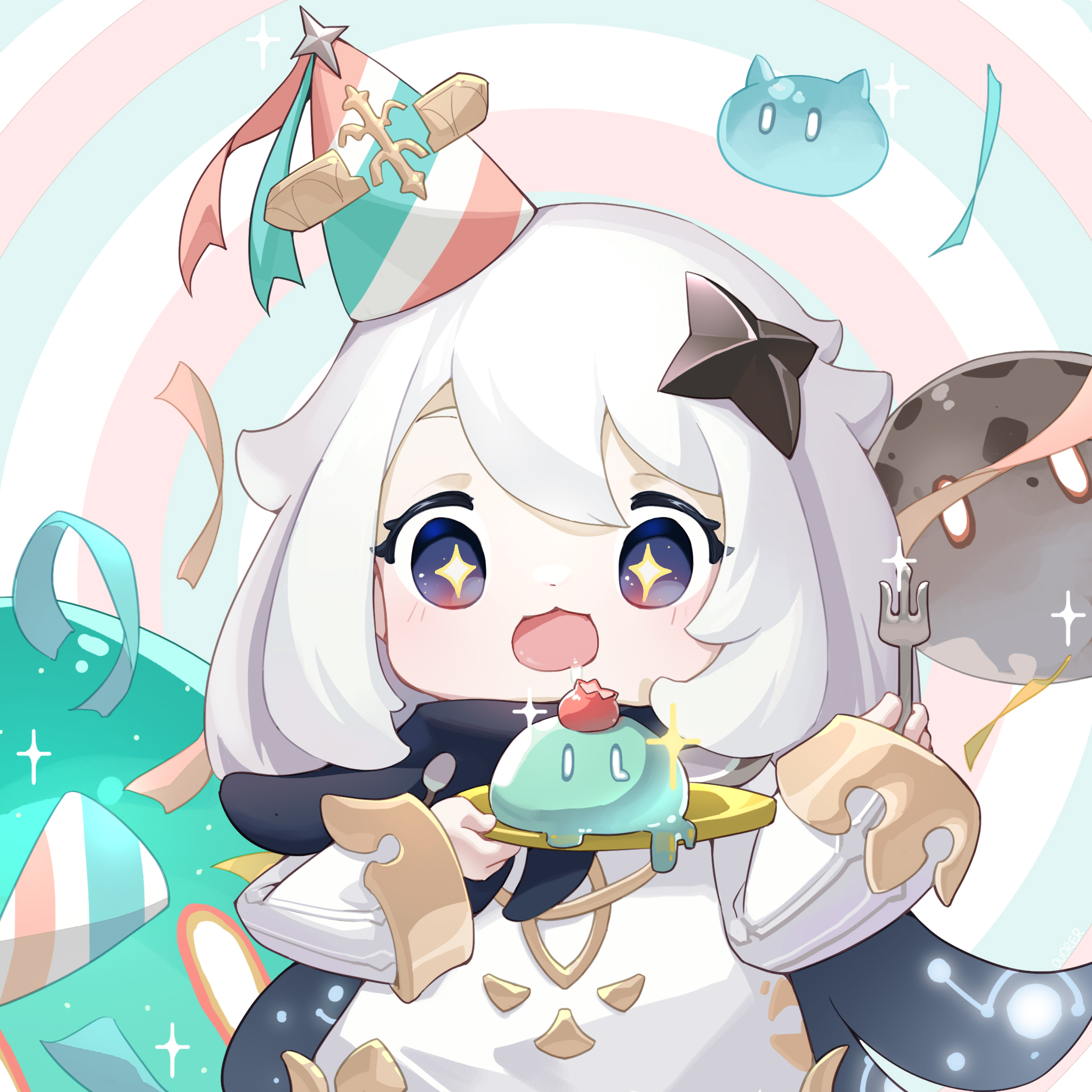 1girl blush commentary_request dress eyelashes fork genshin_impact hat highres holding holding_fork looking_at_viewer open_mouth oufuoujifuji paimon_(genshin_impact) party_hat slime_(genshin_impact) solo sparkling_eyes white_dress white_hair