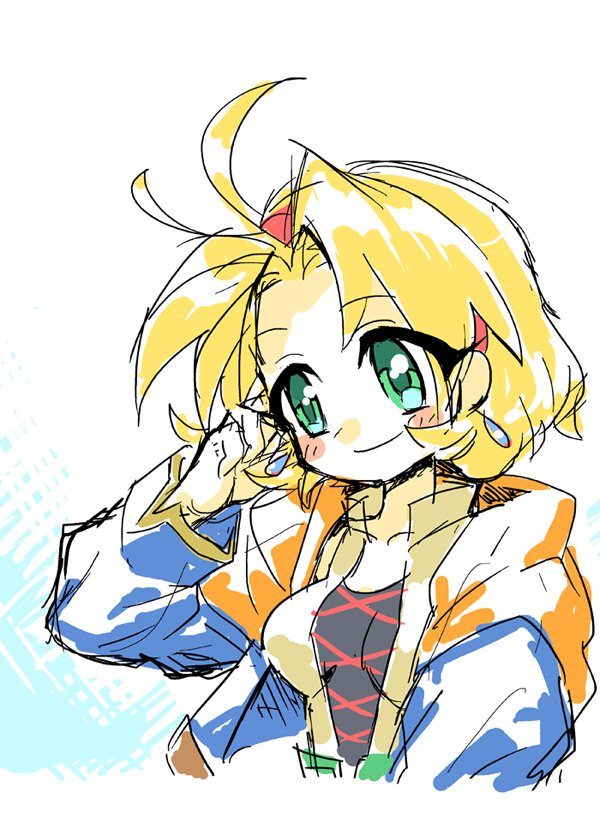 1girl ahoge blonde_hair blush_stickers breasts cecilia_lynne_adelhyde closed_mouth coat commentary_request earrings green_eyes hairband jewelry red_hairband sakakai_toppa short_hair smile solo wild_arms wild_arms_1