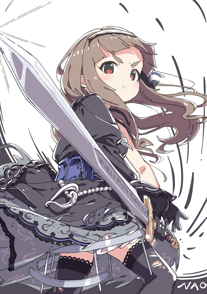 1girl black_dress black_gloves black_thighhighs blunt_bangs brown_hair character_name closed_mouth cowboy_shot dress gloves holding holding_sword holding_weapon idolmaster idolmaster_cinderella_girls kamiya_nao kuresuku_(lessons) long_hair red_eyes short_sleeves simple_background solo sword thick_eyebrows thighhighs v-shaped_eyebrows weapon white_background zettai_ryouiki