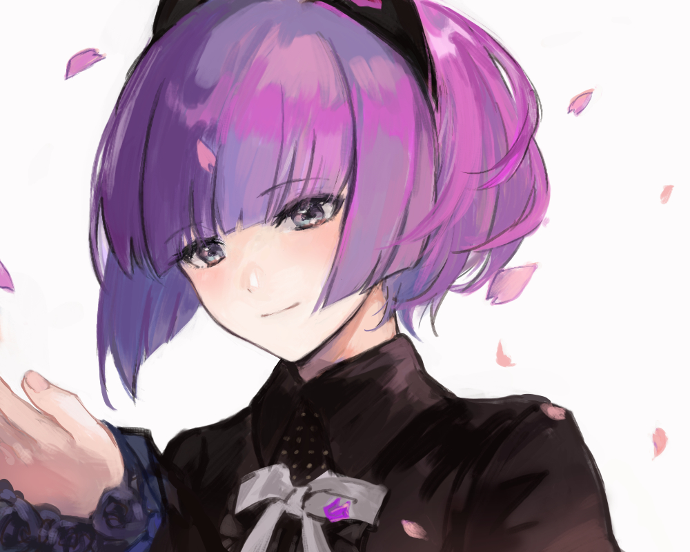 1girl black_shirt blush bow carcano_m91/38_(girls'_frontline) commentary_request girls'_frontline long_hair long_sleeves petals pink_petals purple_eyes purple_hair shirt smile solo tarano_(tsumugiko) white_background