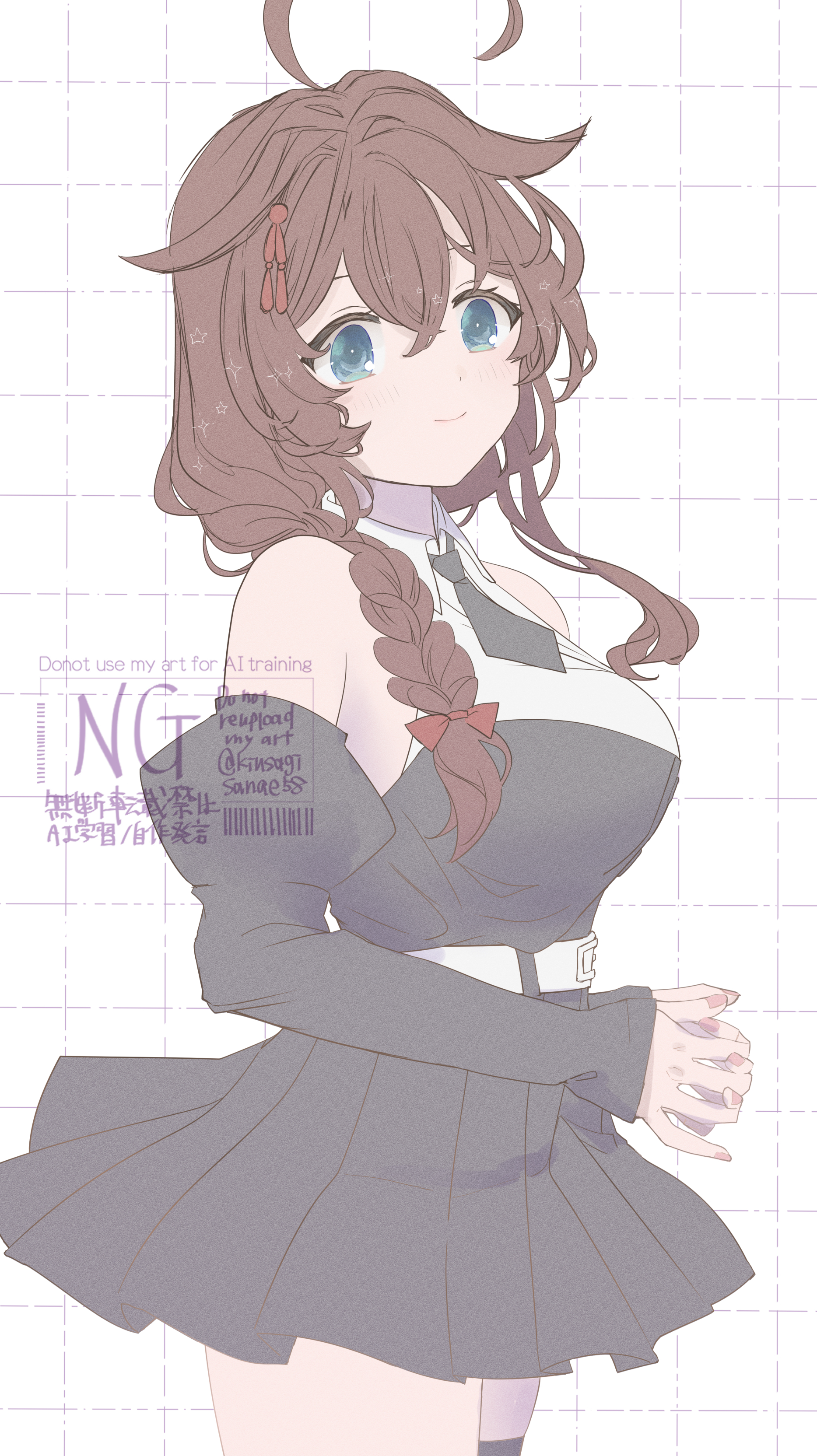 1girl absurdres ahoge belt black_dress black_necktie blue_eyes braid brown_hair collared_shirt commentary_request detached_sleeves dress dress_shirt grid_background hair_flaps hair_over_shoulder highres kantai_collection kiusagi_sanae long_hair necktie official_alternate_costume shigure_(kancolle) shigure_(yokosuka)_(kancolle) shigure_kai_san_(kancolle) shirt single_braid sleeveless sleeveless_shirt solo watermark white_background white_belt white_shirt