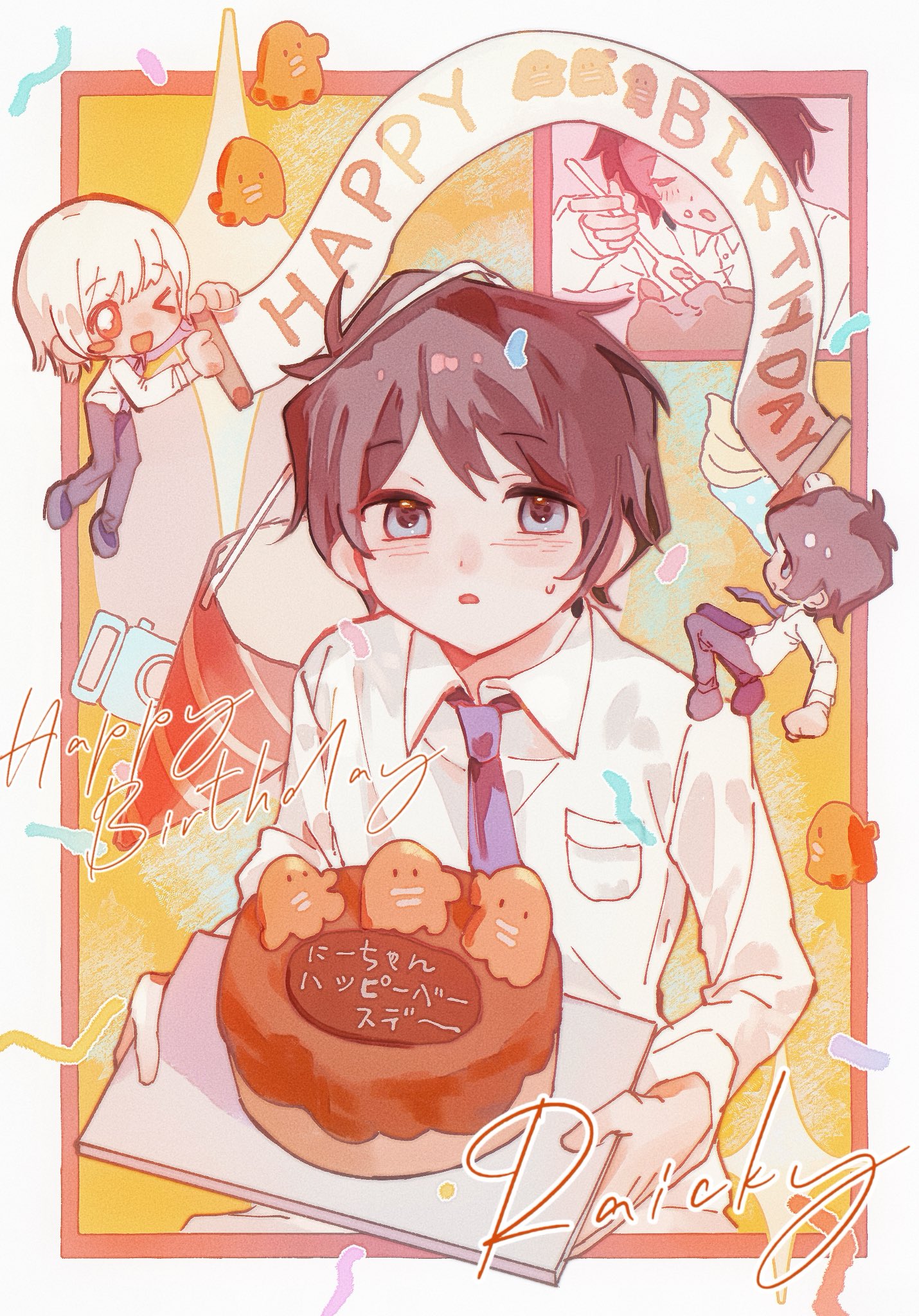 akinashi_haru anesthetic01 birthday birthday_cake black_hair black_pants blue_eyes blue_necktie breast_pocket cake character_request chibi chibi_inset collared_shirt commentary_request dress_shirt food food_art happy_birthday highres holding holding_cake holding_food looking_at_viewer looking_up necktie pants pocket red_eyes saihate_eki shirt short_hair streamers tako-san_wiener tako_(ruuya1124) tatsunami_shion white_hair white_shirt