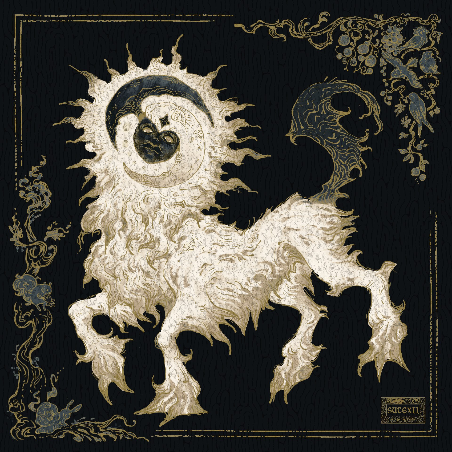 absol black_background border commentary english_commentary gen_3_pokemon highres looking_at_viewer nintendo no_humans ornate_border pokemon pokemon_(creature) pokemon_focus simple_background sutexii tail white_fur