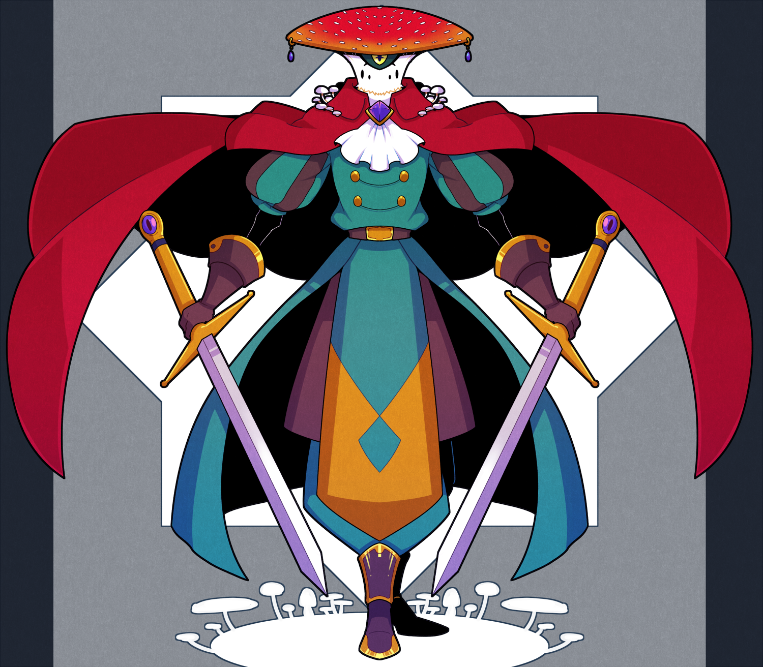 1boy ascot boots brown_gloves cape commentary_request dual_wielding full_body gloves grey_background highres holding holding_sword holding_weapon long_sleeves looking_at_viewer louis_kincy mushroom mushroom_boy n-tousei pixiv_fantasia pixiv_fantasia_last_saga puffy_long_sleeves puffy_sleeves red_cape standing sword weapon white_ascot
