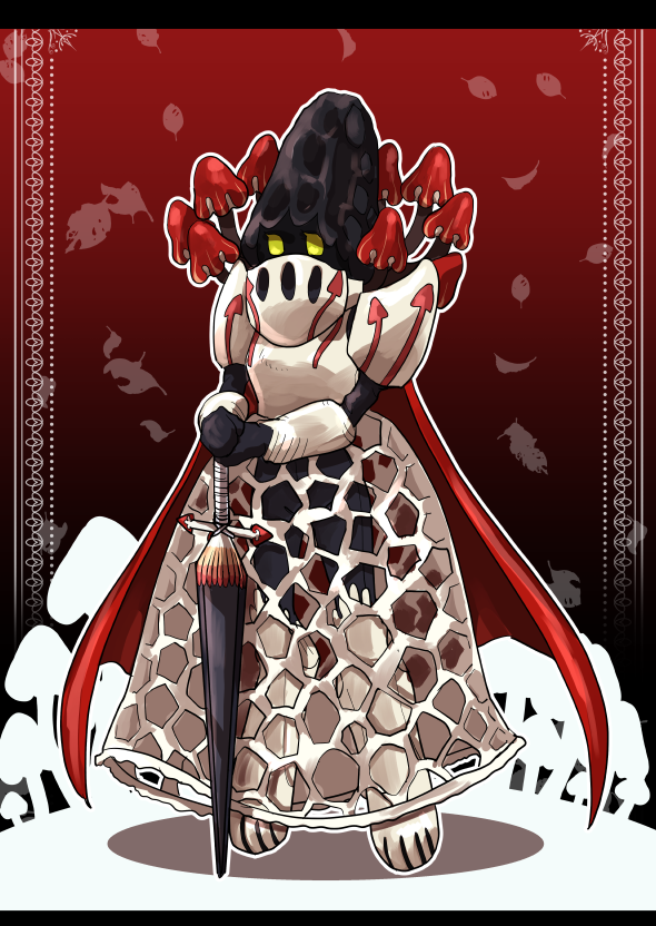 1girl armor black_skin boots cape colored_skin commentary_request kuroooosiro looking_at_viewer mushroom mushroom_girl mushroom_on_head pixiv_fantasia pixiv_fantasia_last_saga planted planted_sword planted_weapon red_background skirt standing sword vale_lansbury weapon yellow_eyes