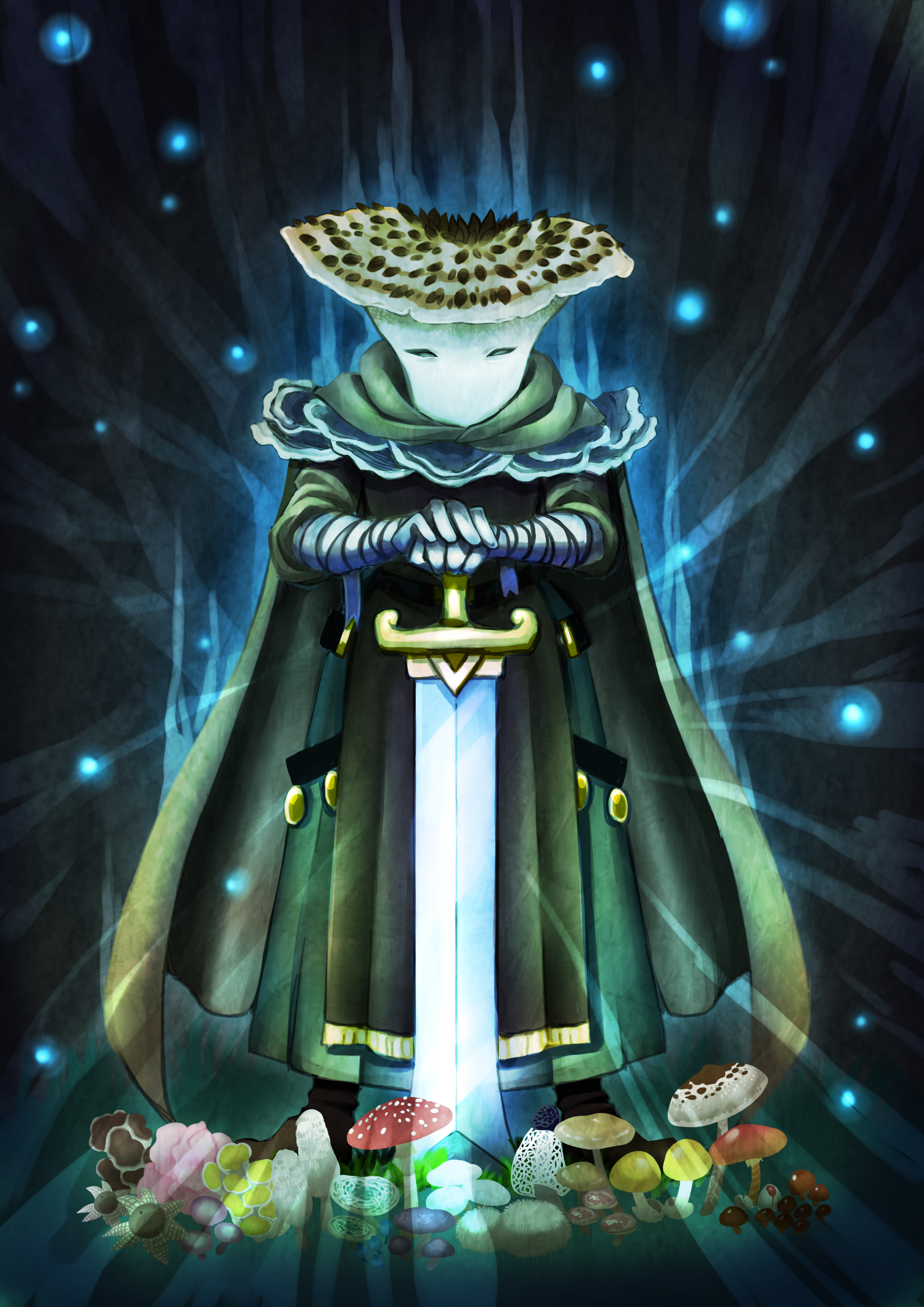1boy cape commentary_request full_body gauntlets green_cape highres lancelot_azplatas looking_at_viewer mushroom mushroom_boy outdoors pixiv_fantasia pixiv_fantasia_last_saga planted standing tanpopo_hayabusa-maru
