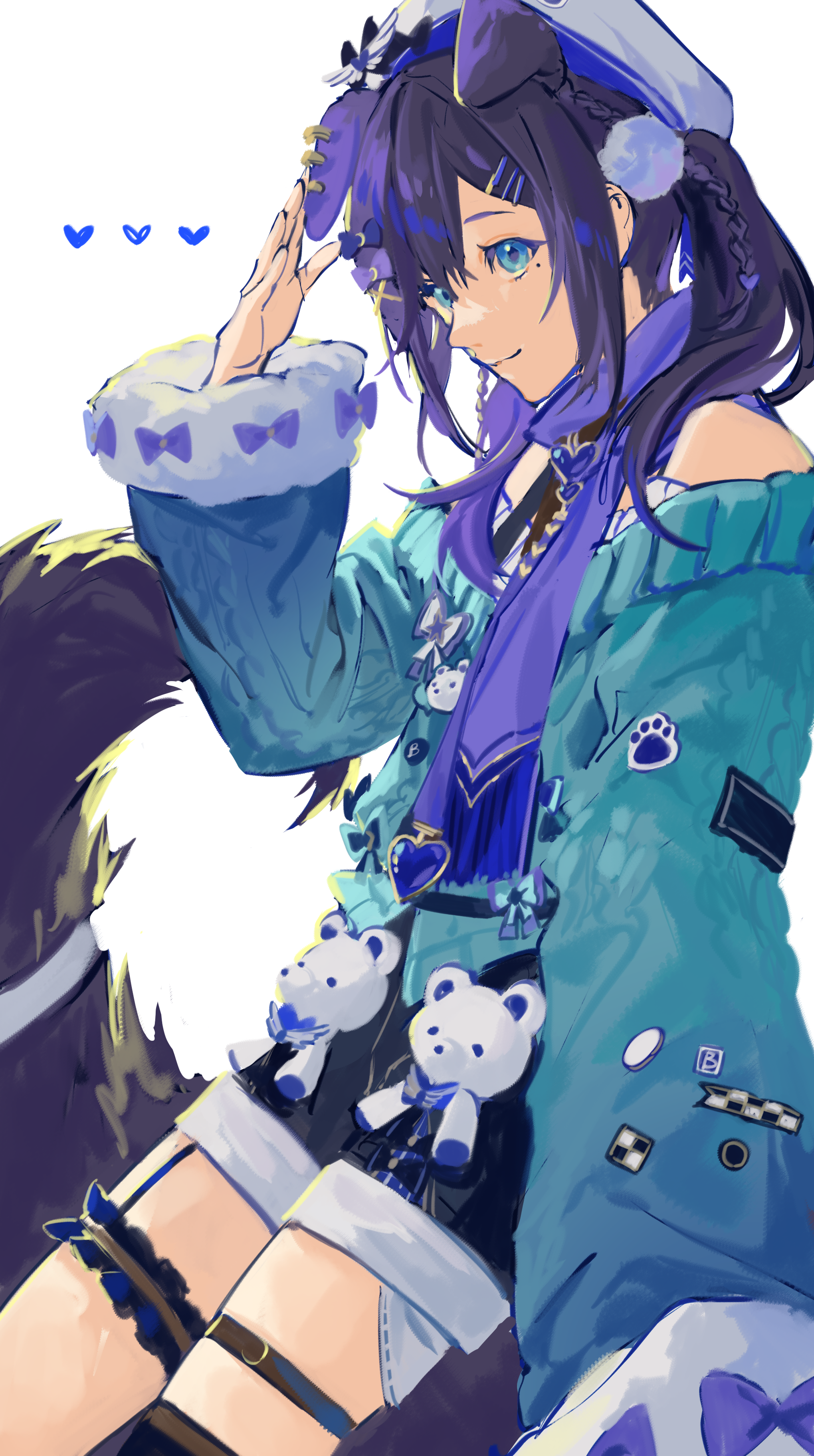 1girl absurdres aiba_uiha aiba_uiha_(2nd_costume) animal_ears bags_under_eyes bare_shoulders blue_eyes blue_hair bow cardigan hair_ornament hairclip hat highres long_sleeves nijisanji overalls pom_pom_(clothes) purple_bow scarf sidelocks simple_background solo stuffed_animal stuffed_toy sweater teddy_bear thighhighs twintails virtual_youtuber white_hat