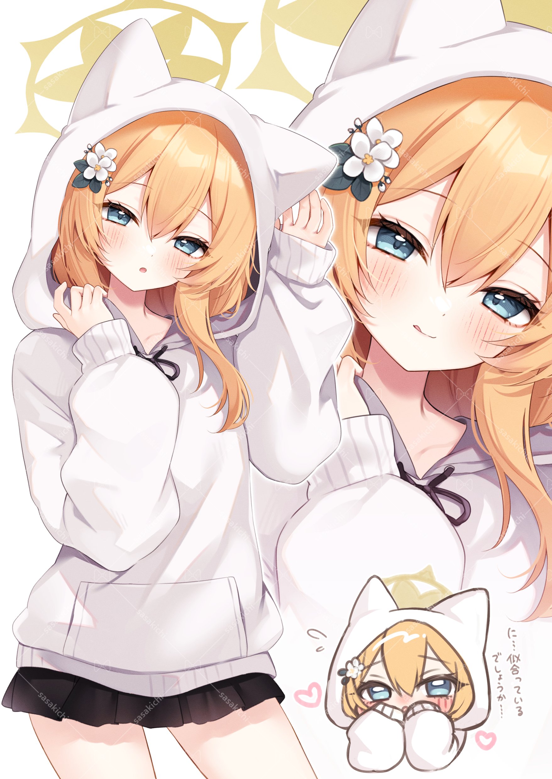 1girl absurdres alternate_costume animal_ear_fluff animal_ears black_skirt blue_archive blue_eyes blush commentary_request flower hair_between_eyes hair_flower hair_ornament halo highres hood hood_up hooded_jacket jacket long_hair long_sleeves looking_at_viewer mari_(blue_archive) miniskirt multiple_views orange_hair pleated_skirt sasakichi_(ssk_chi) skirt smile yellow_halo