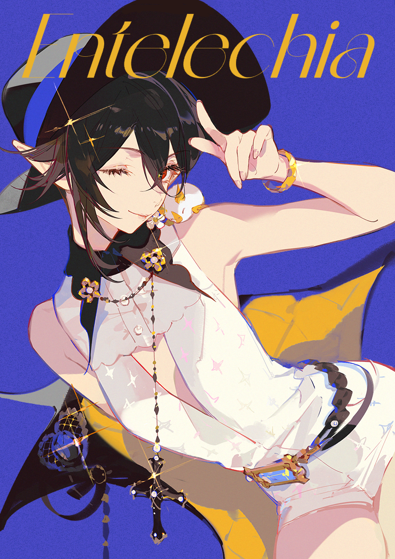 1girl arknights ask_(askzy) bare_arms bare_shoulders black_hair black_hat blue_background breasts character_name closed_mouth commentary dress dutch_angle english_text entelechia_(arknights) entelechia_(dazzling_blue)_(arknights) hair_between_eyes hat jewelry looking_at_viewer official_alternate_costume one_eye_closed pointy_ears red_eyes shirt short_hair shorts simple_background small_breasts smile solo untranslatable_commentary white_shirt white_shorts