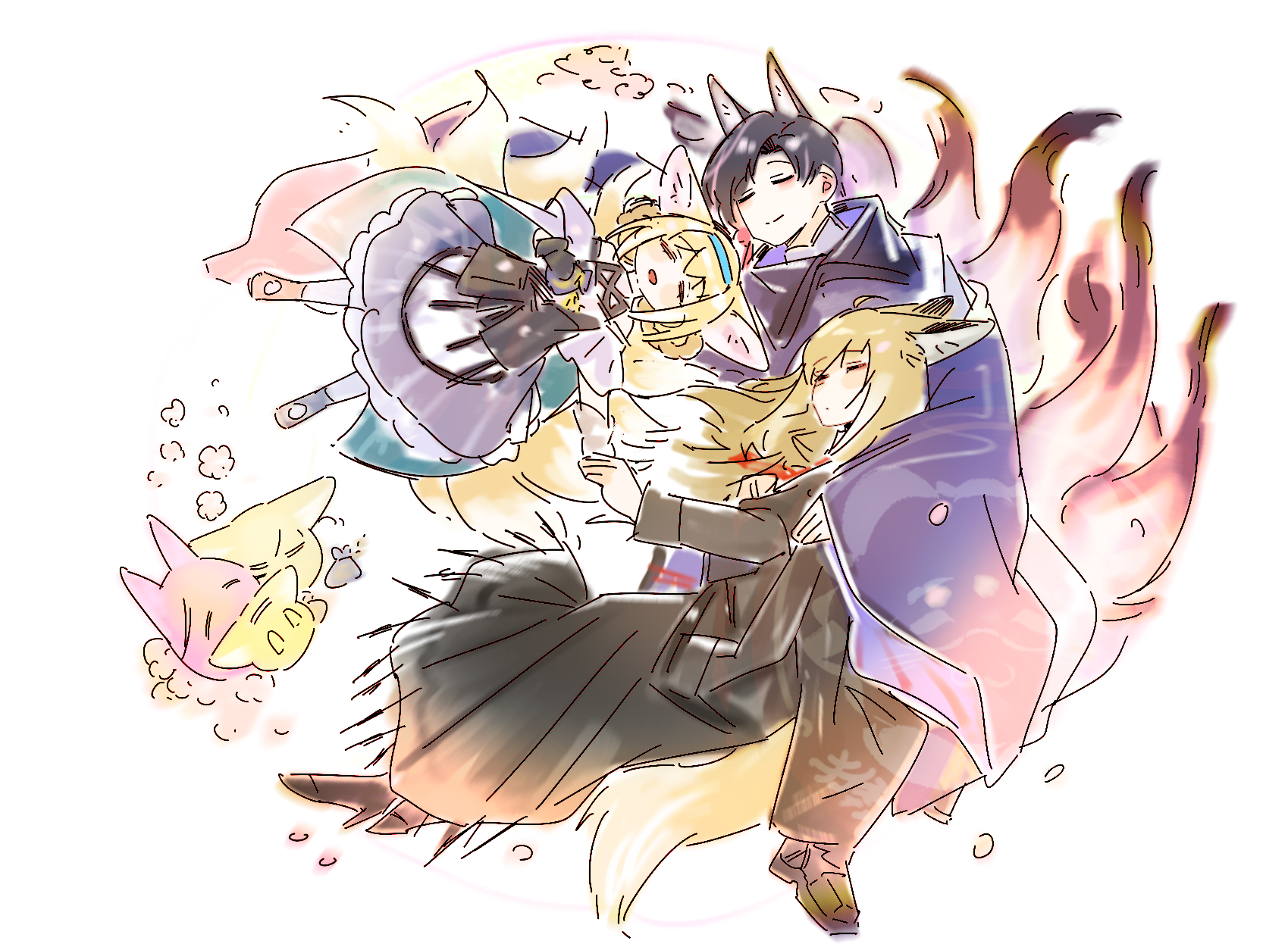 1boy 2girls animal_ears arknights black_dress black_hair blonde_hair blue_dress blue_hairband blue_halo braid braided_hair_rings chinese_commentary closed_eyes closed_mouth commentary_request dress extra_ears family fox_ears fox_girl fox_tail hair_rings hairband halo highres hou_tou_mao_gu kitsune kyuubi long_hair multicolored_hair multiple_girls multiple_tails open_mouth pink_hair short_hair sleeping streaked_hair suzuran's_father_(arknights) suzuran_(arknights) tail twin_braids vulpisfoglia_(arknights)