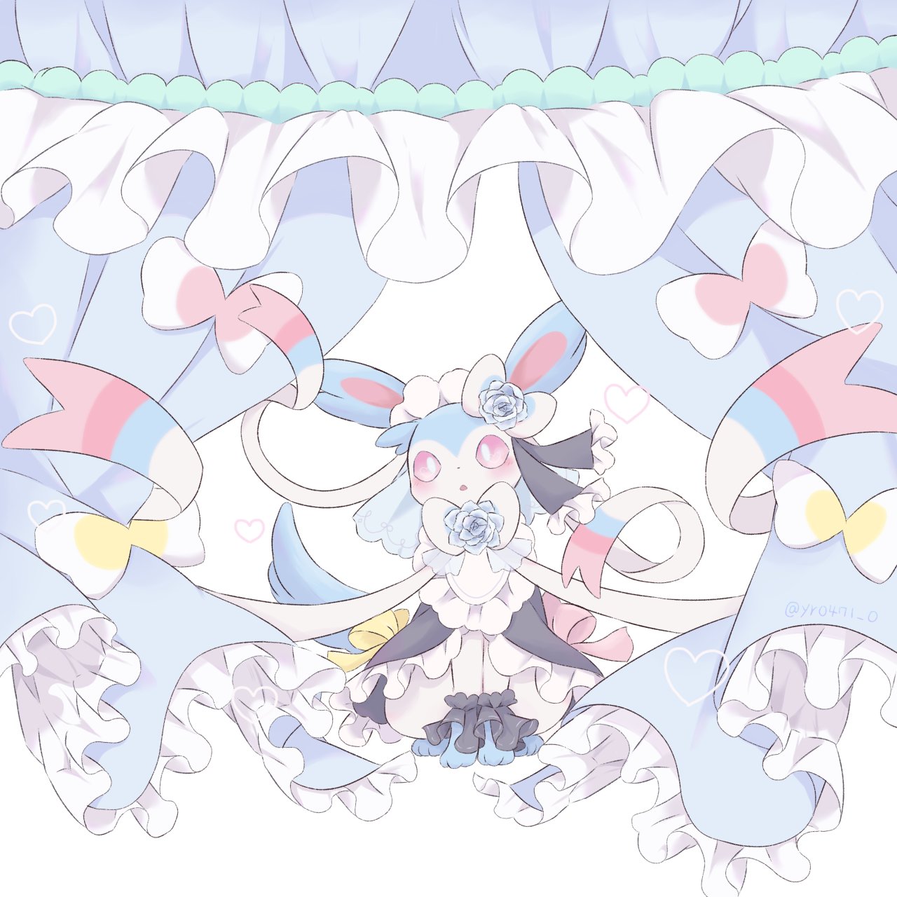 :o alternate_color blush bow clothed_pokemon commentary_request curtain_grab curtains flower frills gen_6_pokemon highres maid nintendo no_humans pink_eyes pokemon pokemon_(creature) shiny_pokemon sitting sylveon yuuri_(yr0471_0)