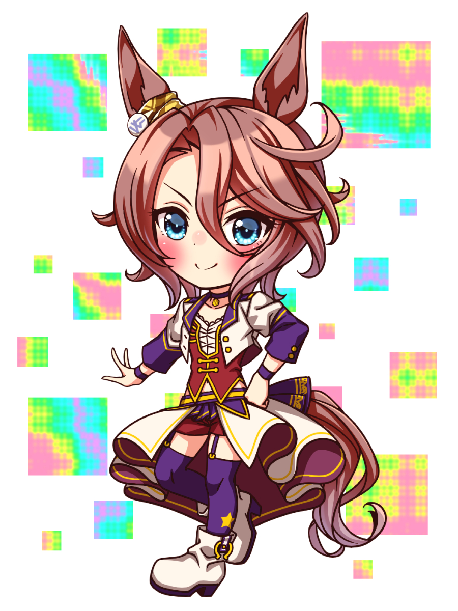1girl animal_ears blue_eyes blush bodice boots breasts brown_hair chibi chibi_only choker closed_mouth collarbone commentary_request corset cropped_jacket ear_ornament full_body garter_straps hair_between_eyes highres horse_ears horse_girl horse_tail jacket long_sleeves looking_at_viewer midriff_peek narita_taishin_(umamusume) navel overskirt pendant_choker purple_choker purple_garter_straps purple_thighhighs red_corset red_shorts shirt short_hair shorts small_breasts smile solo star_(symbol) starting_future_(umamusume) sugimotty_nova tail thighhighs umamusume umapyoi_densetsu white_boots white_jacket white_shirt wristband