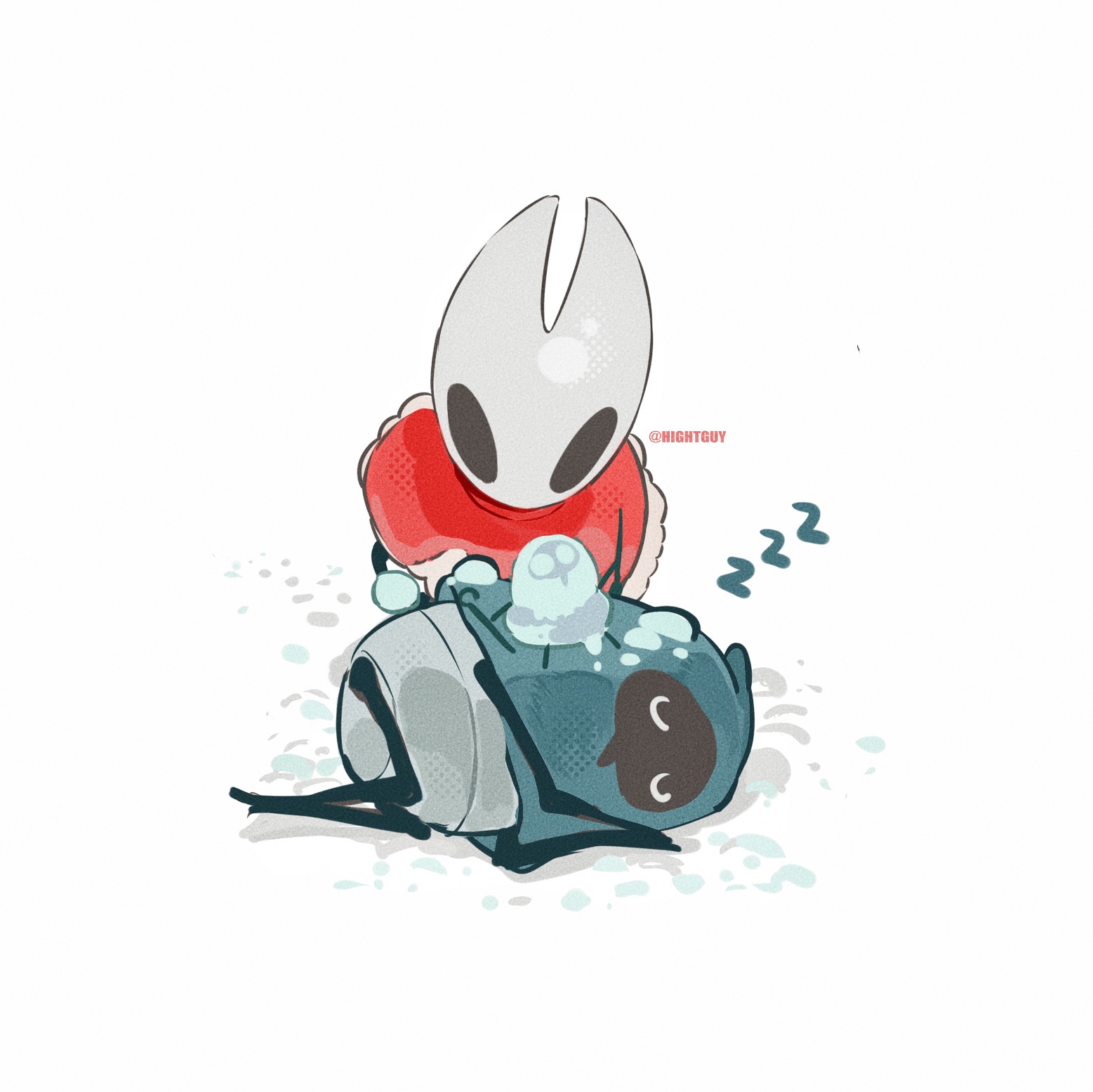 2girls arthropod_girl artist_name ben-day_dots black_eyes blue_cloak chinese_commentary cloak closed_eyes commentary_request film_grain full_body fur-trimmed_cloak fur_trim highres hightguy hollow_knight hollow_knight:_silksong hood hood_up hooded_cloak hornet_(hollow_knight) horns looking_at_another lying multiple_girls on_side own_hands_together pinstress_(hollow_knight) red_cloak screentones simple_background sleeping snow white_background zzz