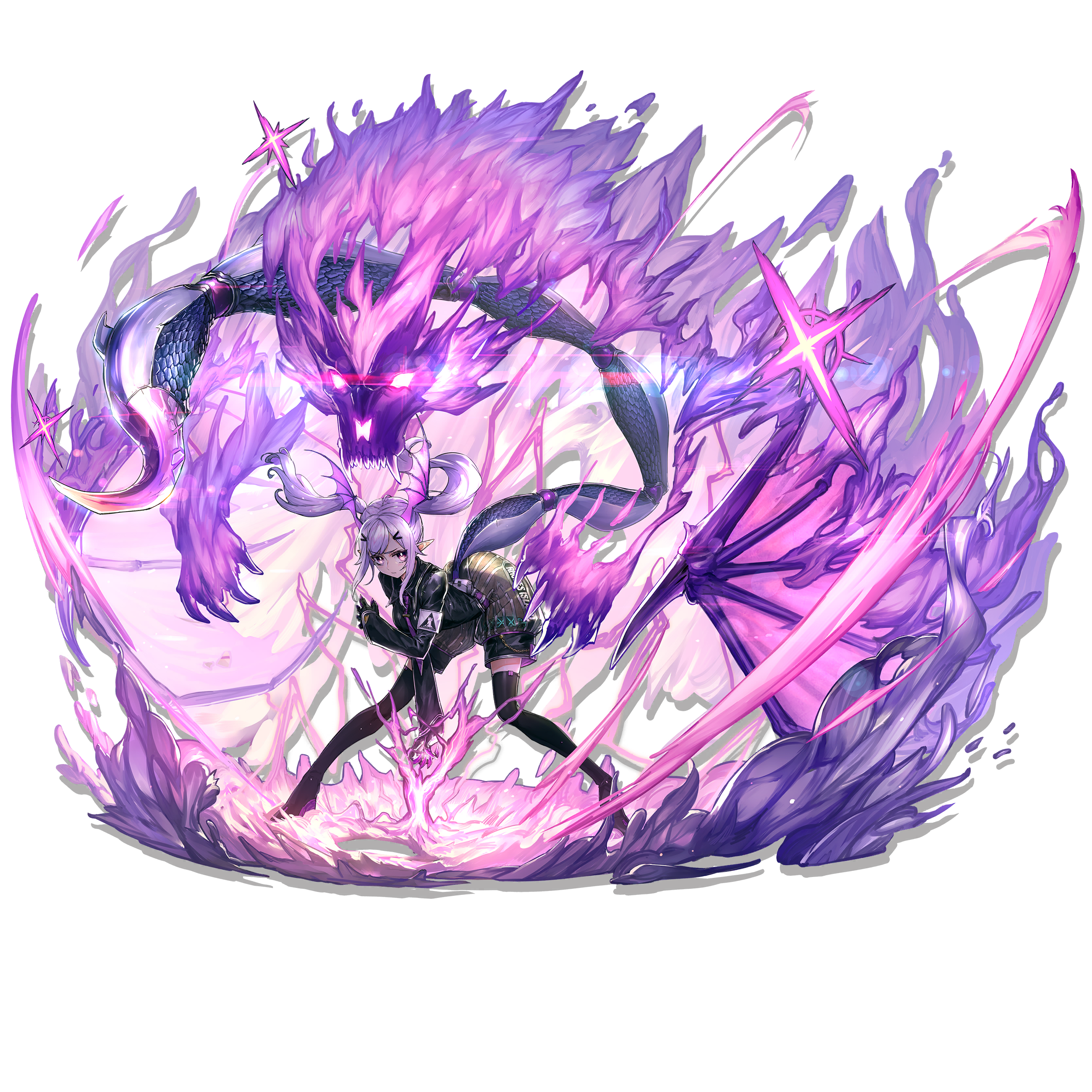 1girl absurdres arknights armband ass bandaged_leg bandages bat_wings belt black_boots black_gloves black_leotard black_shorts blush boots buckle cloak clothes_writing collared_leotard crop_top floating_hair full_body glint gloves glowing glowing_eyes gold hair_ornament hairclip head_wings highres jewelry leaning_forward leotard long_hair long_sleeves looking_at_viewer manticore_(arknights) manticore_(elite_ii)_(arknights) necklace necktie official_art originium_arts_(arknights) pants parted_lips pointy_ears purple_eyes purple_hair purple_necktie purple_theme rhodes_island_logo_(arknights) ryuuzaki_ichi scorpion_tail see-through_clothes see-through_legwear see-through_pants short_shorts shorts sidelocks solo tail thigh_boots thighhighs transparent_background twintails very_long_tail wings
