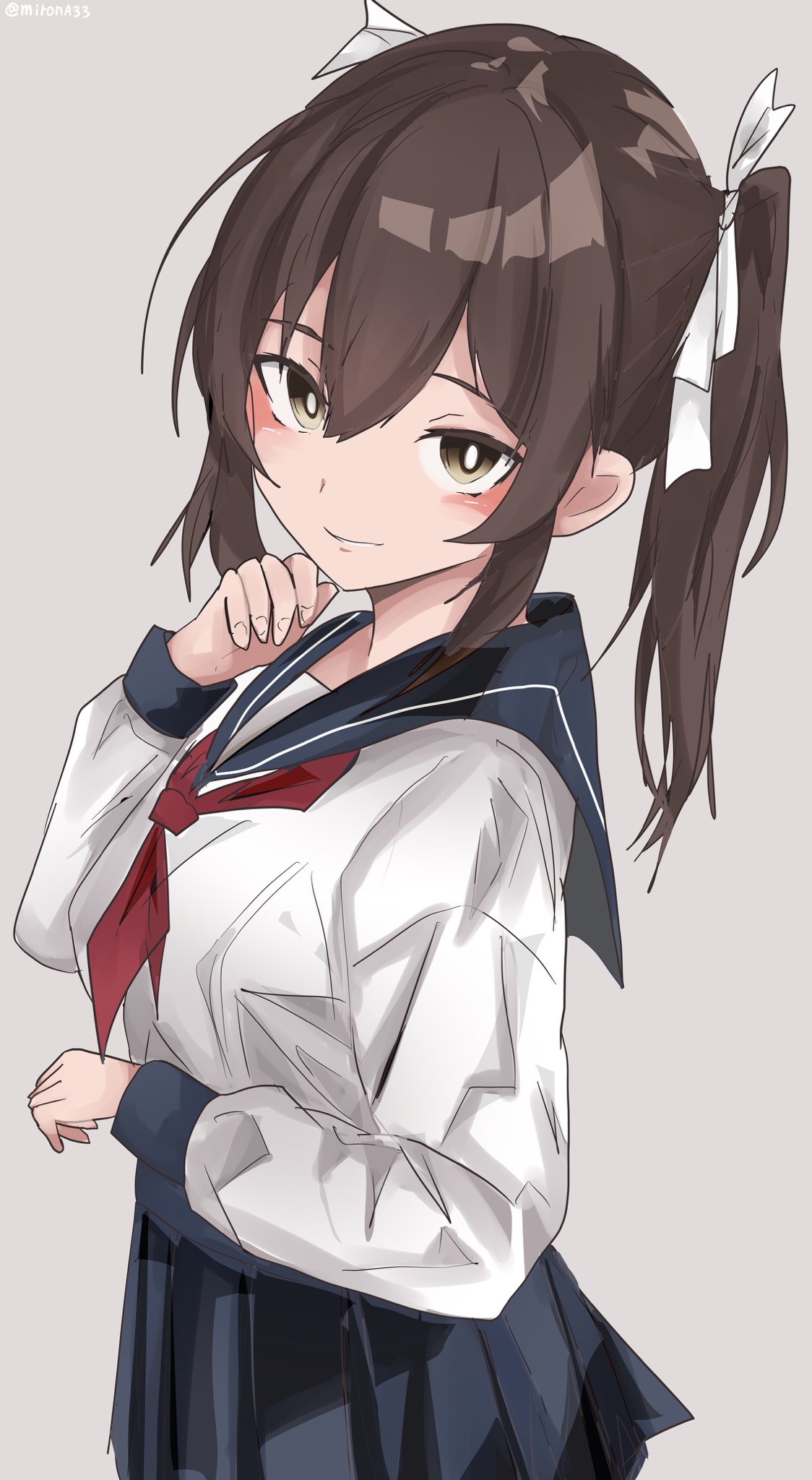 1girl alternate_costume black_hair black_sailor_collar black_skirt brown_eyes commentary_request cowboy_shot grey_background highres kantai_collection long_hair long_sleeves miron_(mirona33) neckerchief pleated_skirt red_neckerchief sailor_collar sailor_shirt school_uniform serafuku shirt simple_background skirt solo tone_(kancolle) twintails white_shirt