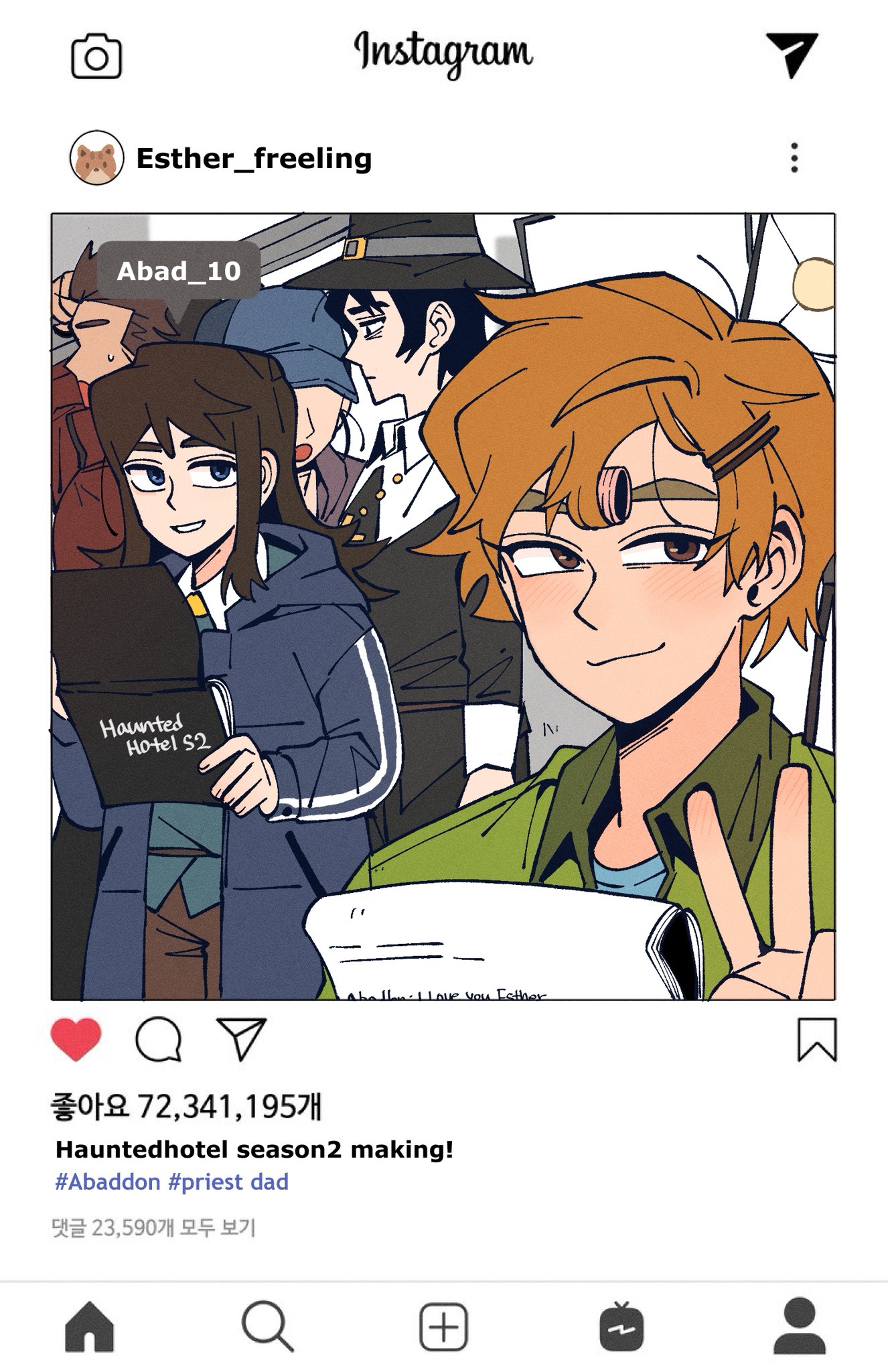 2girls 3boys abaddon_(haunted_hotel) blue_eyes brown_eyes brown_hair coat commentary_request english_text esther_freeling fake_phone_screenshot fake_screenshot film_set hair_rollers haunted_hotel highres holding holding_paper insidej043 instagram korean_commentary korean_text long_hair looking_at_viewer mixed-language_text multiple_boys multiple_girls orange_hair paper priest_(haunted_hotel) script short_hair translation_request v