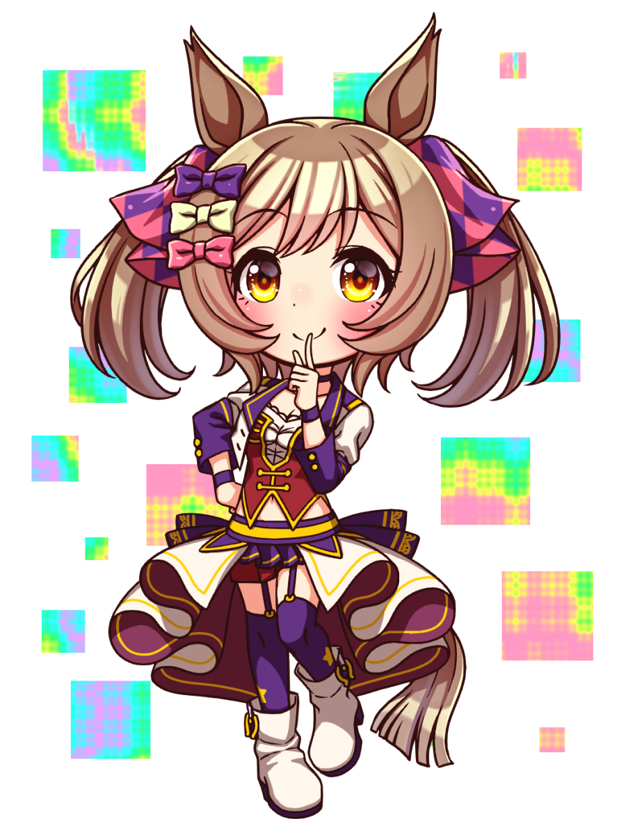 1girl animal_ears blush bodice boots bow breasts brown_eyes brown_hair chibi chibi_only choker cleavage closed_mouth collarbone commentary_request corset cropped_jacket finger_to_mouth full_body garter_straps hair_between_eyes hair_bow highres horse_ears horse_girl horse_tail jacket long_sleeves looking_at_viewer medium_hair midriff_peek multiple_hair_bows navel overskirt pendant_choker pink_bow purple_bow purple_choker purple_garter_straps purple_thighhighs red_corset red_shorts shirt shorts small_breasts smart_falcon_(umamusume) smile solo star_(symbol) starting_future_(umamusume) sugimotty_nova tail thighhighs twintails umamusume white_boots white_jacket white_shirt wristband yellow_bow