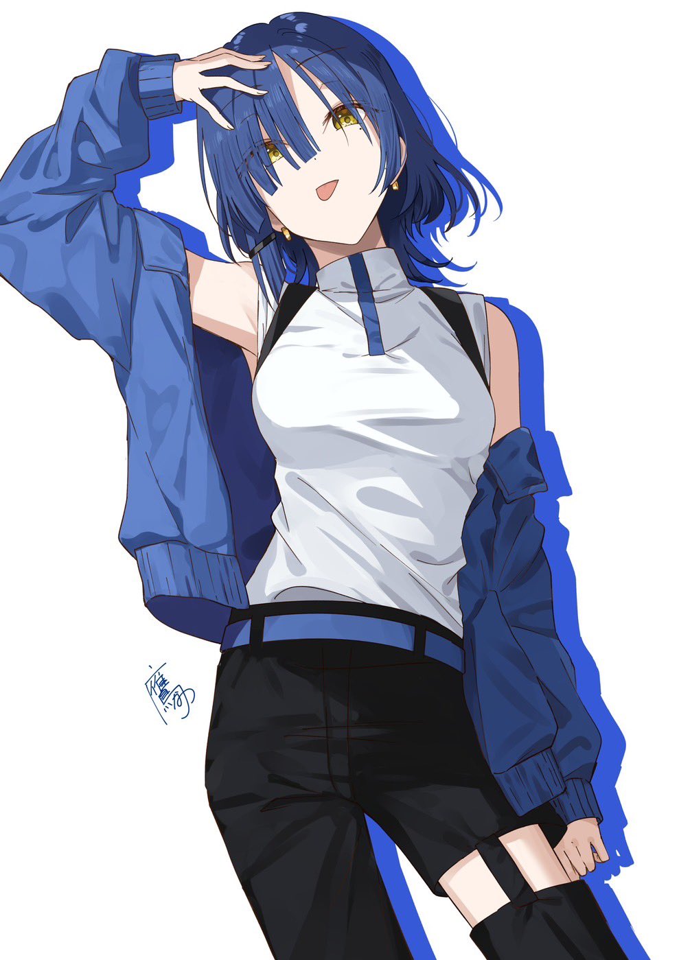 1girl bare_shoulders black_pants blue_hair blue_jacket bocchi_the_rock! commentary_request earrings hair_ornament hairclip highres jacket jewelry kanaria_hisagi long_sleeves looking_at_viewer medium_hair mole mole_under_eye open_clothes open_jacket pants shirt tongue tongue_out white_shirt yamada_ryo yellow_eyes