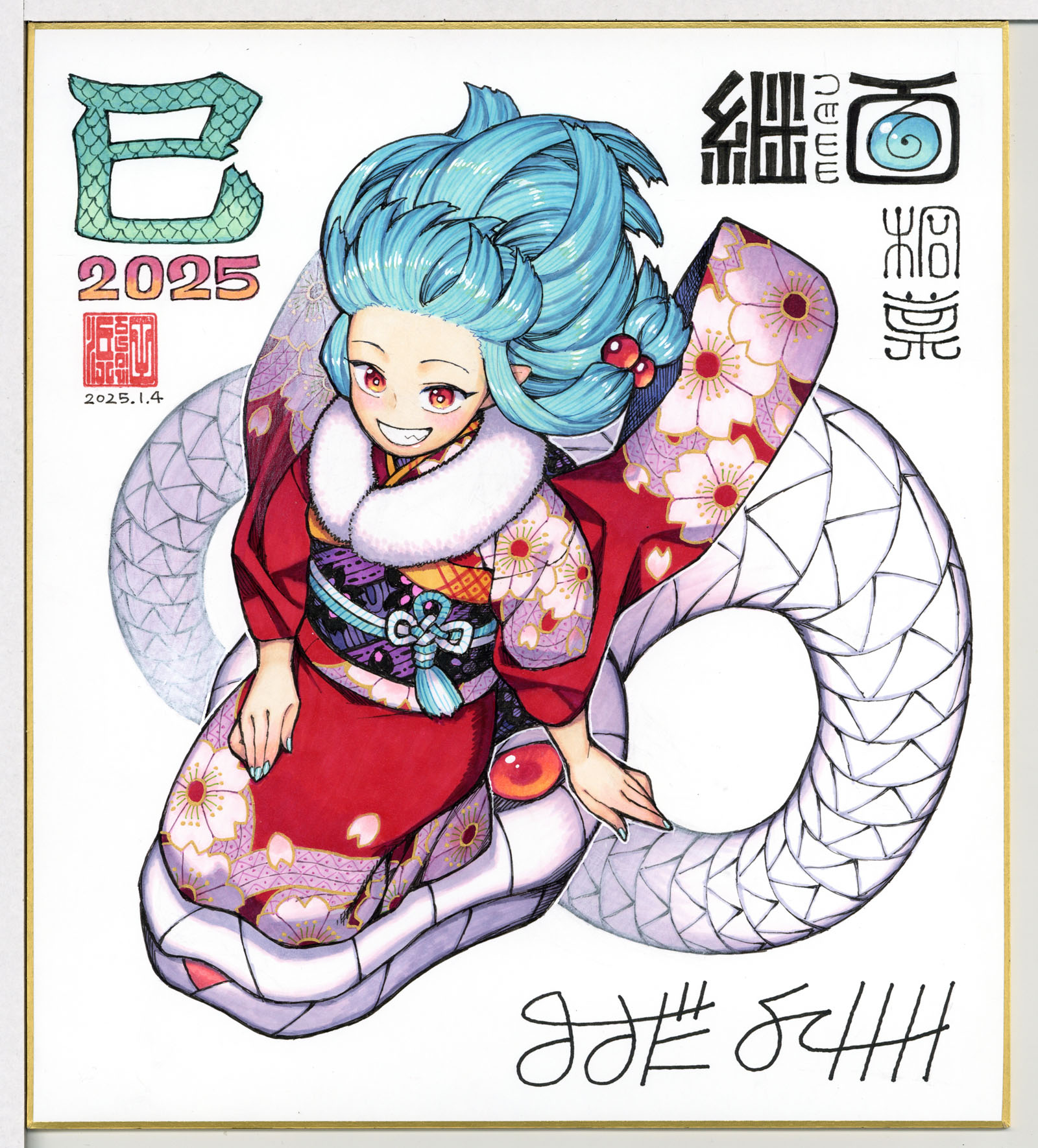 1girl 2025 blue_hair chinese_zodiac commentary_request floral_print floral_print_kimono fur_collar grin hair_bobbles hair_ornament hamada_yoshikazu highres japanese_clothes kimono kiriha_(tsugumomo) long_hair long_sleeves looking_at_viewer obi photo_(medium) pointy_ears print_kimono red_eyes revision sash seiza shikishi signature simple_background sitting smile snake solo traditional_media tsugumomo white_background white_snake wide_sleeves year_of_the_snake