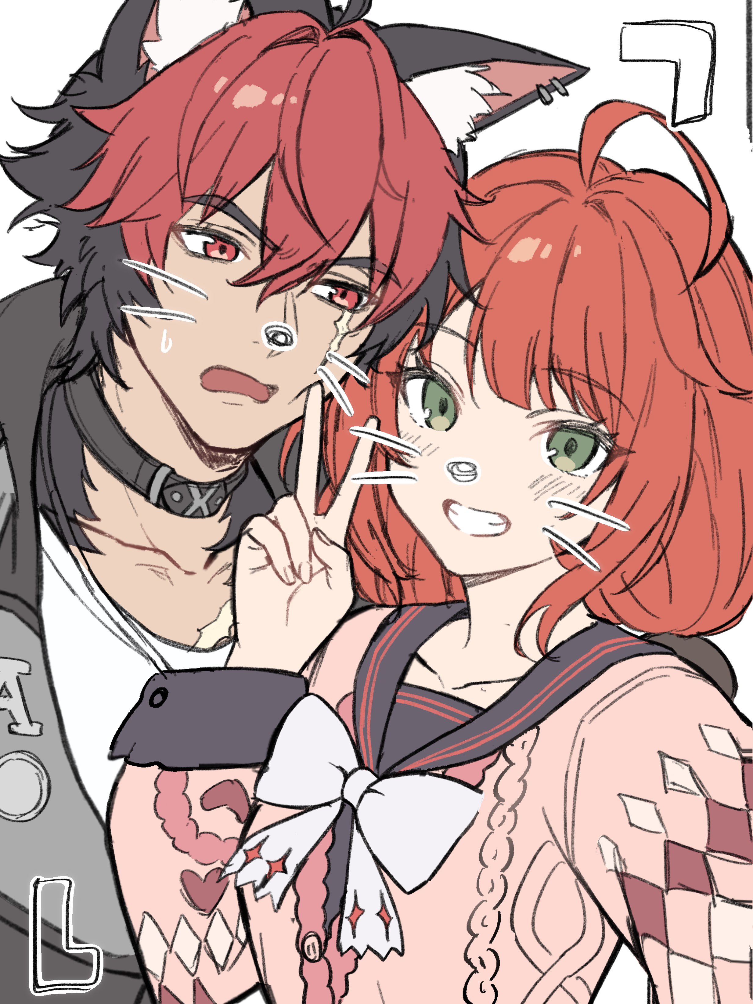 1boy 1girl absurdres animal_ears black_choker black_hair black_jacket blush choker commentary_request dog_boy dog_ears dwun_pubg green_eyes highres jacket komano_manato multicolored_hair pink_sweater red_eyes red_hair ribbon scar scar_on_chest scar_on_face shirt sweater taking_picture ukinami_yuzuha v white_ribbon white_shirt zenless_zone_zero