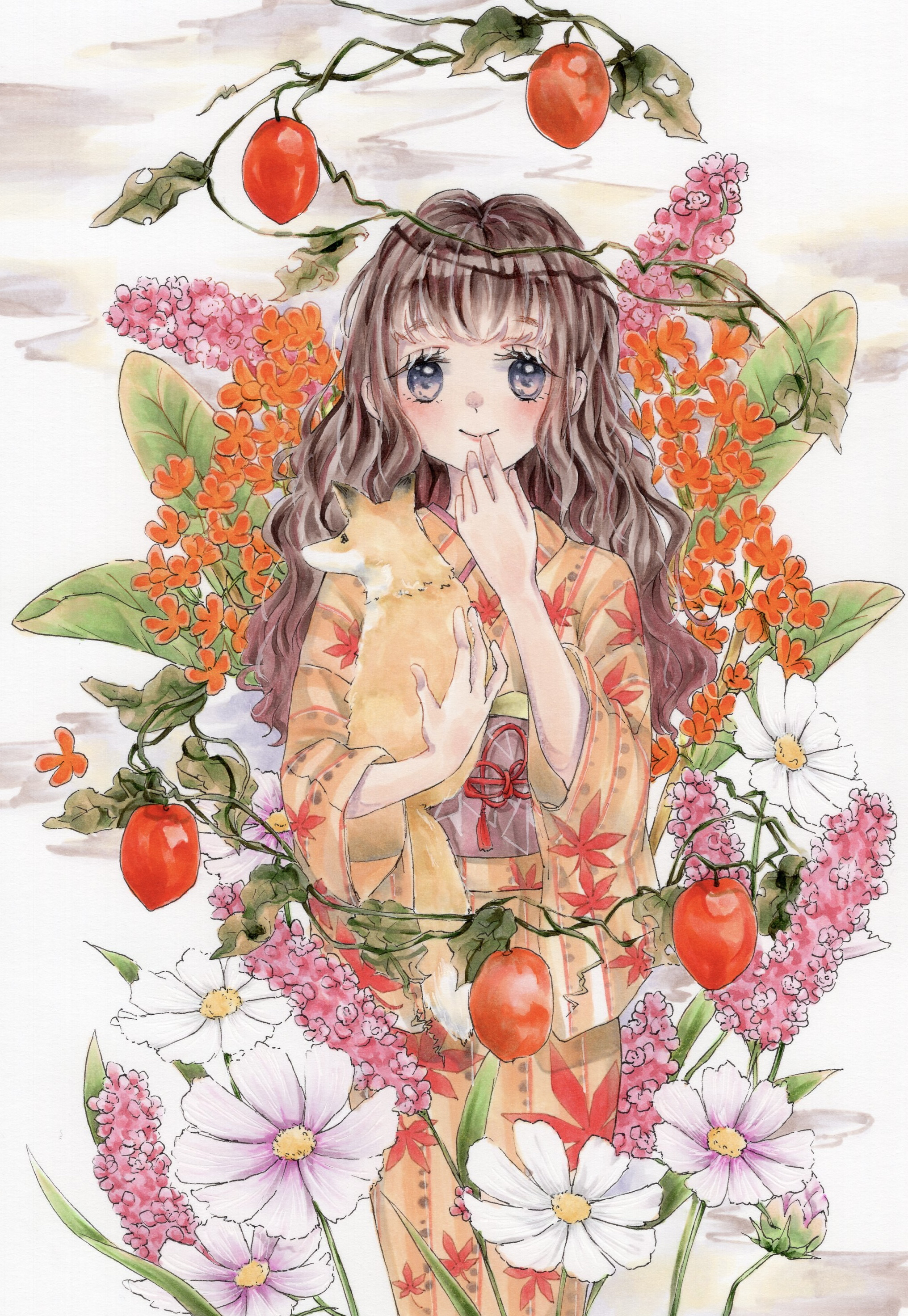 1girl absurdres animal brown_hair check_commentary commentary commentary_request floral_print floral_print_kimono flower food fox fruit grey_eyes hand_to_own_mouth highres holding holding_animal hyaku_toori japanese_clothes kimono long_hair looking_at_viewer marker_(medium) nature original plant print_kimono smile solo traditional_media vines wavy_hair