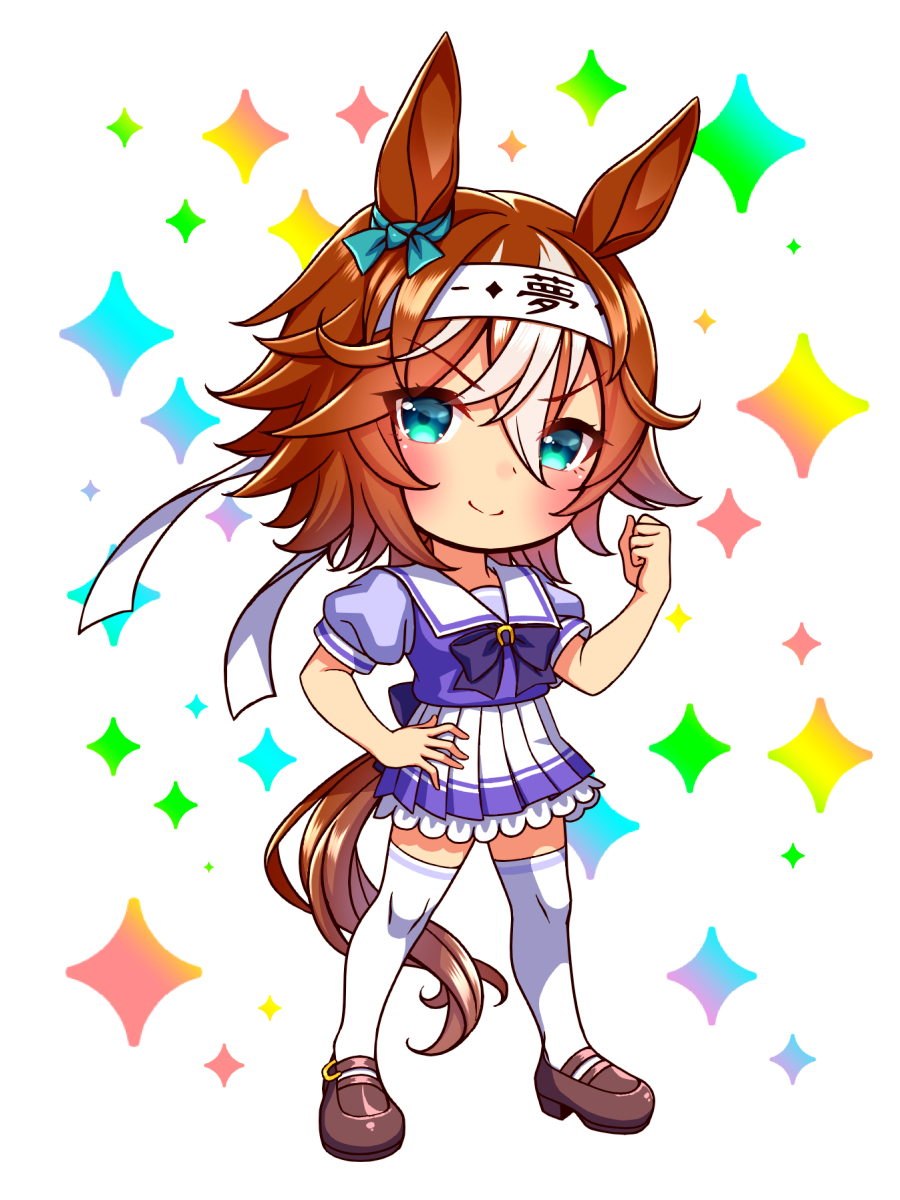 1girl animal_ears bamboo_memory_(umamusume) blue_eyes blush bow bowtie breasts brown_hair chibi chibi_only clenched_hand closed_mouth commentary_request ear_bow full_body hair_between_eyes hand_on_own_hip headband highres horse_ears horse_girl horse_tail looking_at_viewer multicolored_hair pleated_skirt puffy_short_sleeves puffy_sleeves purple_bow purple_bowtie purple_shirt sailor_collar sailor_shirt school_uniform shirt shoes short_hair short_sleeves skirt smile solo streaked_hair sugimotty_nova tail thighhighs tracen_school_uniform umamusume white_hair white_headband white_sailor_collar white_skirt white_thighhighs zettai_ryouiki