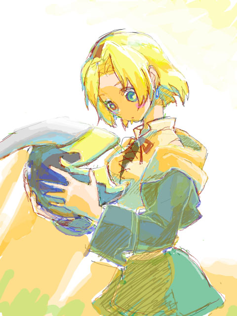 1girl blonde_hair blush_stickers boomerang_flash cecilia_lynne_adelhyde closed_mouth coat commentary_request earrings green_eyes hairband helmet holding jewelry red_hairband sakakai_toppa short_hair smile solo unworn_headwear unworn_helmet vest wild_arms wild_arms_1
