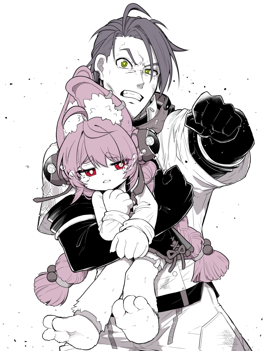 1boy 1girl amida_murasaki animal_ear_fluff animal_ear_piercing animal_ears animal_feet barefoot black_hair braid commentary_request damian_blackwood furry furry_female green_eyes limited_palette parted_lips pink_hair rabbit_ears rabbit_girl red_eyes simple_background twin_braids white_background zenless_zone_zero zhao_(zenless_zone_zero)