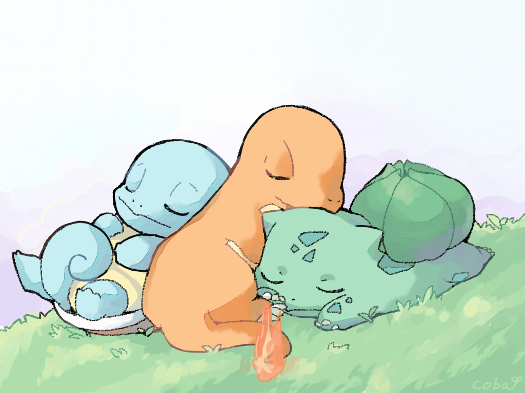 animal_focus bulbasaur charmander closed_eyes closed_mouth coba_to_coba commentary_request fire flame-tipped_tail gen_1_pokemon grass nintendo no_humans nostrils on_ground pokemon pokemon_(creature) sleeping squirtle starter_pokemon_trio tail white_background