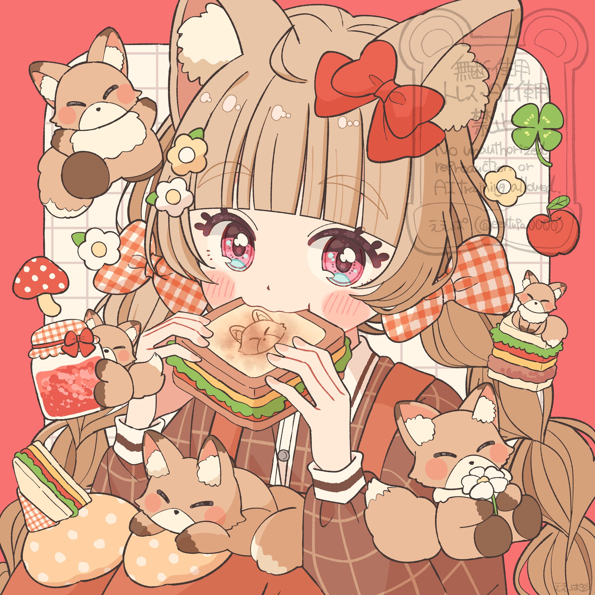 1girl animal animal_ear_fluff animal_ears apple blonde_hair blunt_bangs blush_stickers border bow braid brown_shirt closed_mouth clover commentary eating eeppa food four-leaf_clover fox fox_ears fox_girl fruit gingham_bow grid_background hair_bow highres holding holding_food holding_sandwich jam jar long_hair long_sleeves looking_at_viewer mushroom original outside_border pink_eyes red_border red_bow sandwich shirt solo thick_eyebrows twin_braids upper_body watermark white_background
