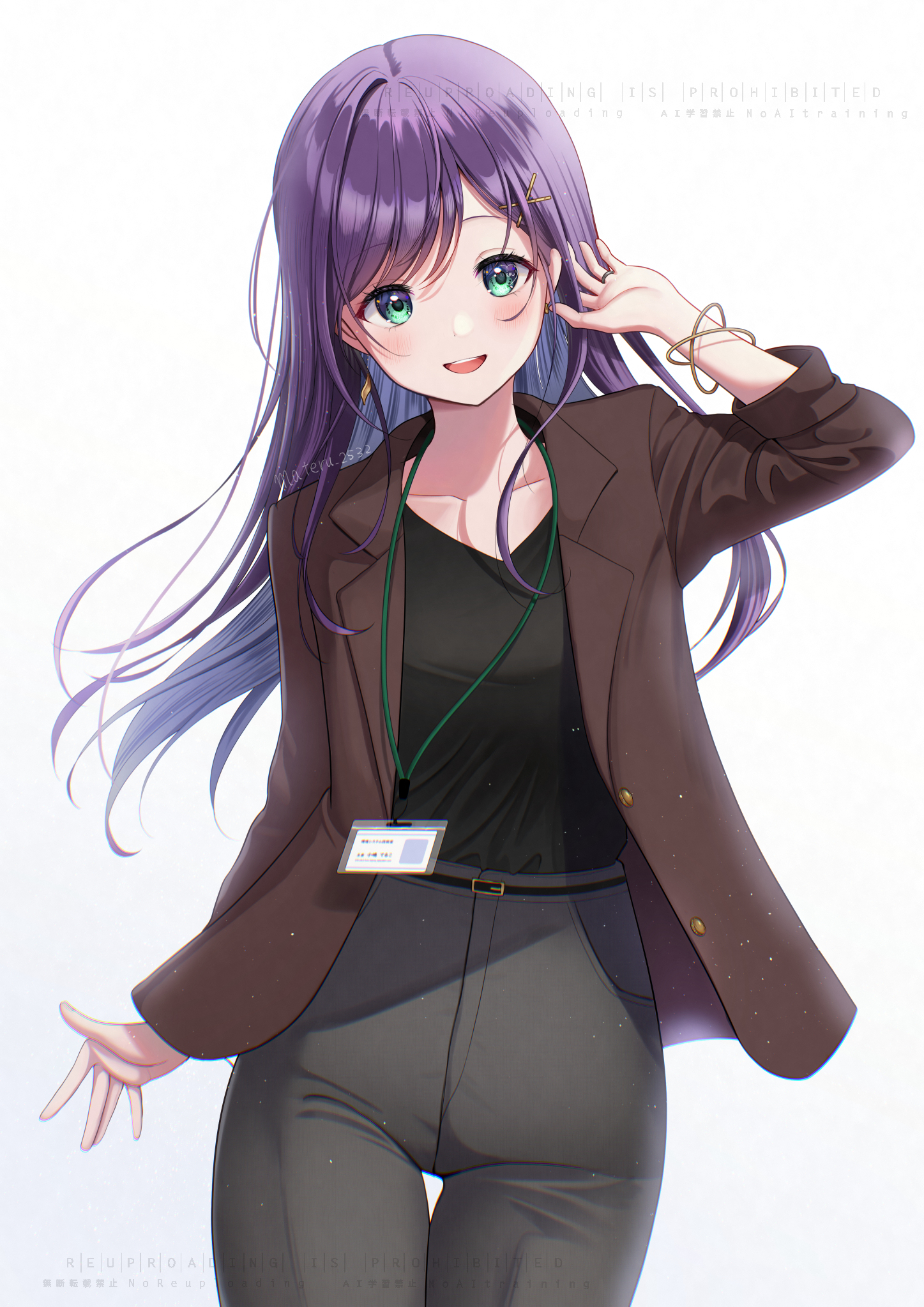 1girl black_shirt blush bracelet breasts brown_jacket collarbone commentary_request earrings green_eyes grey_pants hair_ornament hairclip highres id_card jacket jewelry kojima-senpai_(materu2532) lanyard long_hair long_sleeves looking_at_viewer materu_(2532) office_lady open_clothes open_jacket open_mouth original pants purple_hair shirt simple_background smile solo