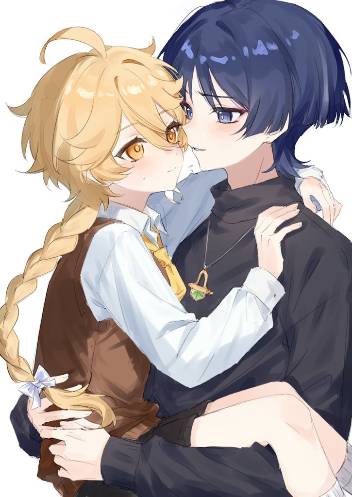 2boys aether_(genshin_impact) aged_down ahoge arm_around_neck black_shorts black_sweater blonde_hair blue_eyes blue_hair blunt_ends blush bow braid bright_pupils brown_sweater_vest carrying carrying_person child closed_mouth collared_shirt commentary earrings english_commentary eyeshadow feet_out_of_frame fingernails from_side genshin_impact hair_between_eyes hair_bow hand_on_another's_shoulder hands_up jewelry long_hair long_sleeves looking_at_another low-braided_long_hair low-tied_long_hair makeup male_focus multiple_boys necklace necktie official_alternate_costume orange_eyes parted_bangs puffy_long_sleeves puffy_sleeves red_eyeshadow scaramouche_(genshin_impact) shirt short_hair shorts simple_background single_braid single_earring smile socks sweatdrop sweater sweater_vest teeth tsuyaryouyado turtleneck turtleneck_sweater upper_body wanderer_(genshin_impact) wanderer_(impression)_(genshin_impact) white_background white_bow white_pupils white_shirt white_socks yellow_necktie