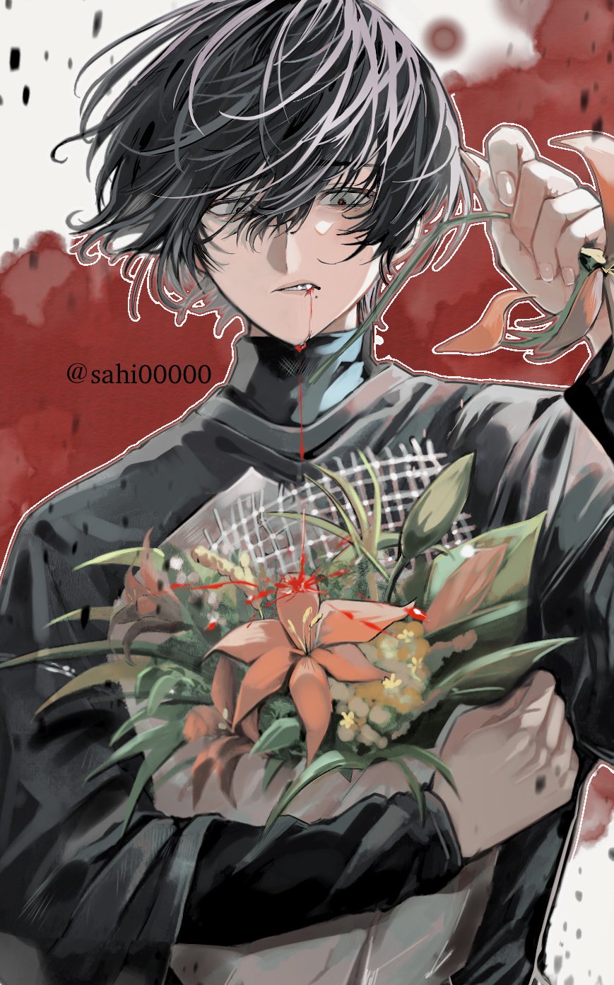 1boy bag black_hair black_shirt blood blood_drip blood_from_mouth commentary_request fang fingernails flower grey_eyes hair_between_eyes hand_up highres holding holding_bag holding_flower long_sleeves looking_at_viewer male_focus mole mole_under_mouth original paper_bag parted_lips plant red_flower sahi00000 shirt short_hair solo swept_bangs upper_body
