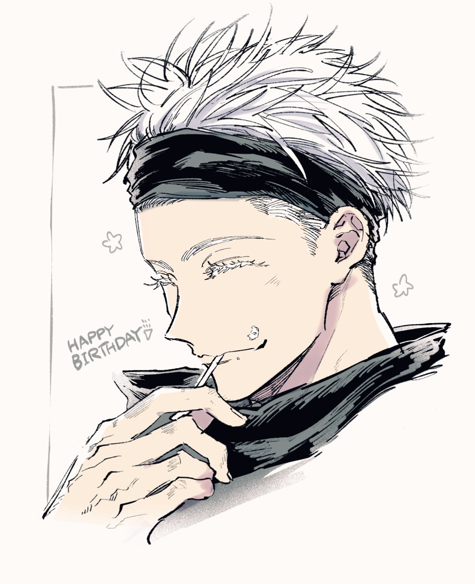 1boy blindfold_on_head candy closed_mouth colored_eyelashes commentary_request cropped_head eyelashes food gojo_satoru happy_birthday jujutsu_kaisen lollipop male_focus nay_bb short_hair simple_background solo white_background white_eyelashes white_hair