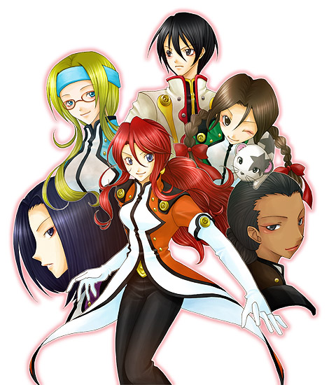 00s 1boy 5girls black_hair blonde_hair blue_eyes brown_eyes brown_hair cogwheel dark_skin diana_caprice gemini_sunrise glasses kujou_subaru multiple_girls noko_(sakura_taisen) one_eye_closed red_hair rikaritta_aries sagitta_weinberg sakura_taisen sakura_taisen_v sega taiga_shinjirou uniform wink