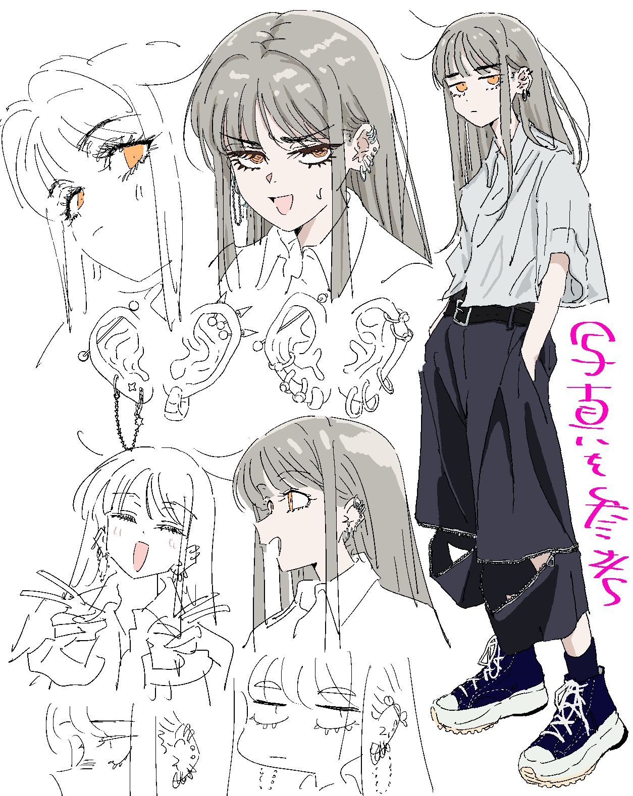 1girl belt blush earrings highres jewelry kazenota2 long_hair multiple_persona open_mouth original piercing shoes skirt smile sneakers