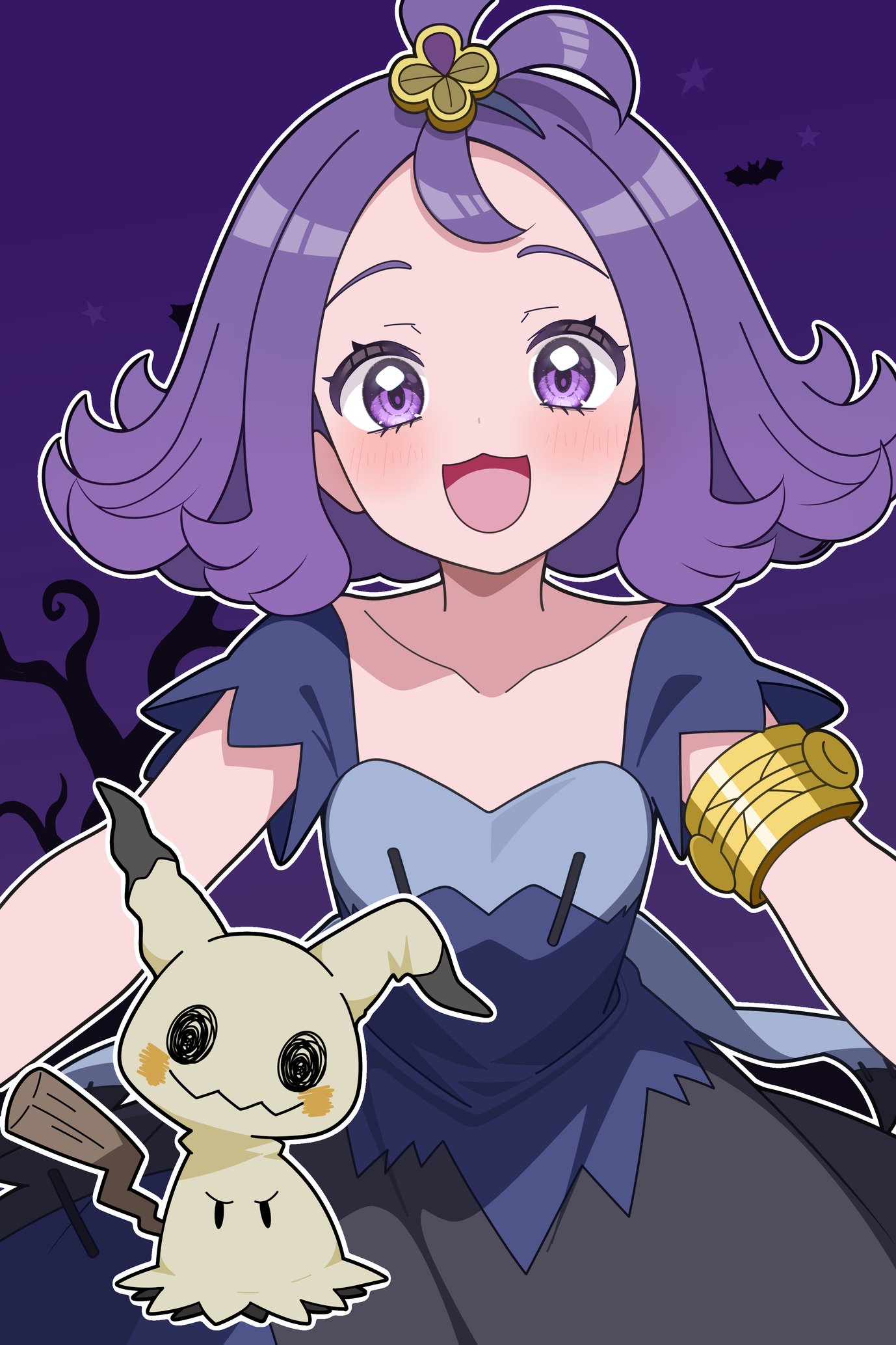 1girl acerola_(pokemon) armlet black_dress blue_dress blush collarbone commentary_request dress flipped_hair gen_7_pokemon hair_ornament highres jewelry looking_at_viewer mimikyu nintendo odorukaminoke open_mouth pokemon pokemon_(creature) pokemon_sun_and_moon purple_eyes purple_hair short_hair short_sleeves smile solid_oval_eyes topknot torn_clothes torn_dress