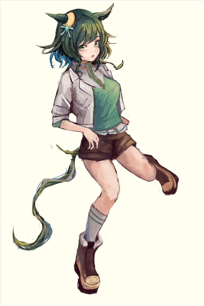 1girl animal_ears boots breasts brown_boots brown_shorts commentary_request ears_through_headwear full_body green_eyes green_hair green_vest hat horse_ears horse_girl horse_tail jacket kiseki_(miracle_author)_(umamusume) kiseki_(umamusume) looking_at_viewer parted_lips shirt short_hair shorts simple_background solo tail umamusume vest white_jacket white_shirt yanagi_wakana yellow_hat