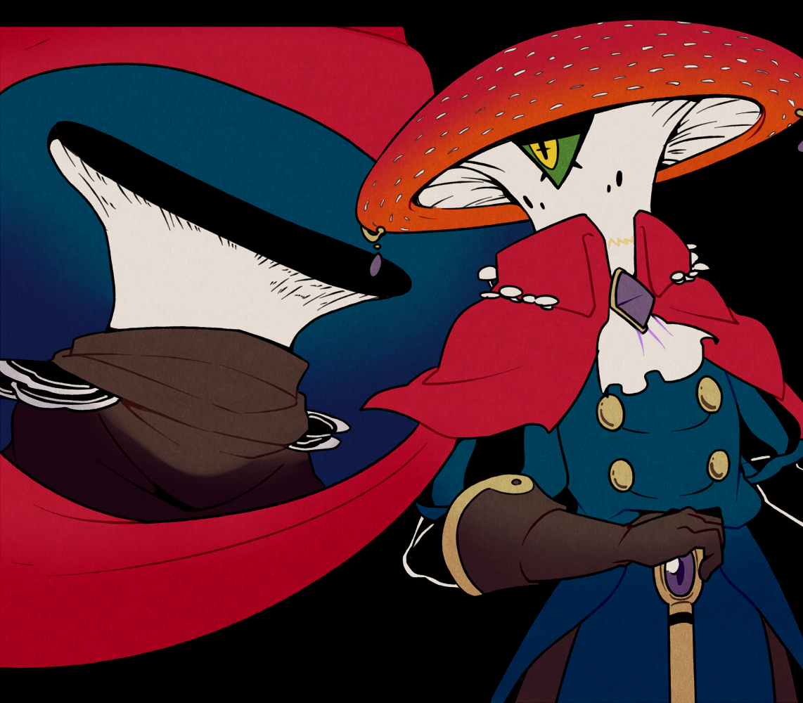 2boys arthur_knight_of_the_dense_woodland ascot cape commentary_request gloves louis_kincy multiple_boys mushroom_boy n-tousei one-eyed pixiv_fantasia pixiv_fantasia_last_saga red_cape sword weapon