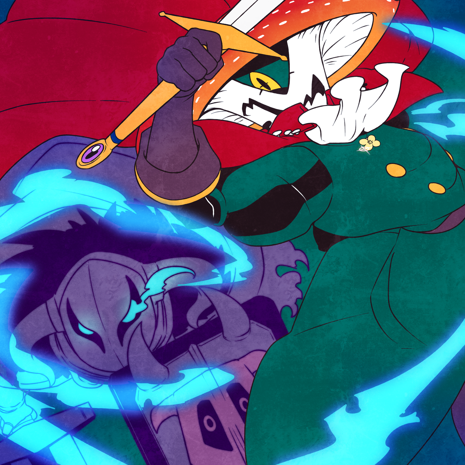 2boys ascot battle blue_eyes cape commentary_request glowing glowing_eyes helmet highres louis_kincy mercenary_leader_folgades multiple_boys mushroom_boy n-tousei one-eyed pixiv_fantasia pixiv_fantasia_last_saga red_cape shield