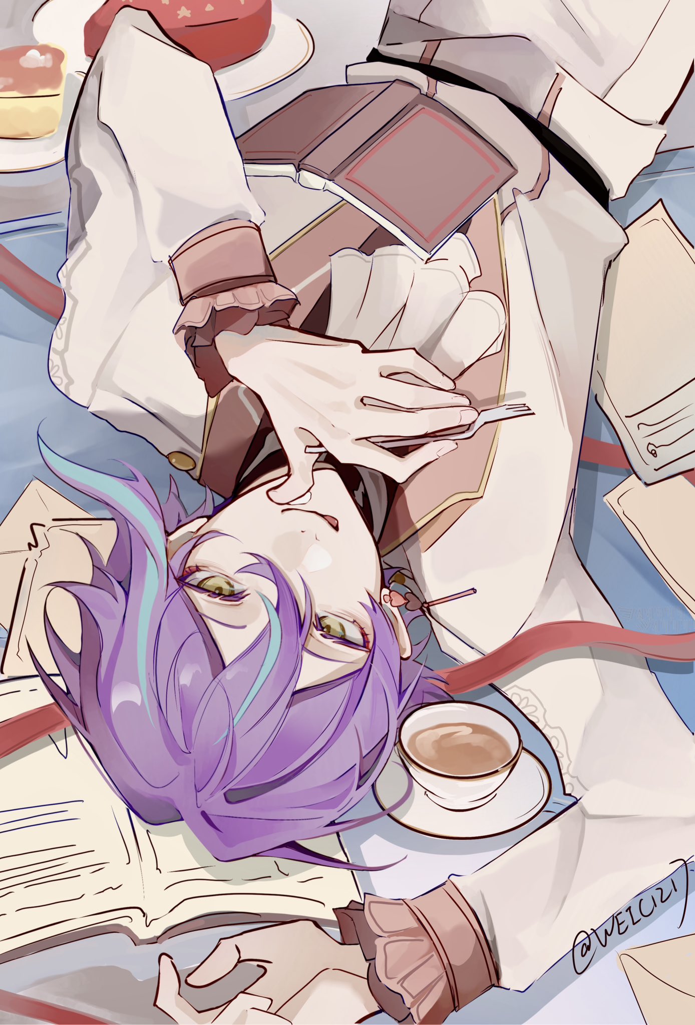1boy book cake cake_slice coffee coffee_mug cup food fork from_above hashtag-only_commentary highres holding holding_fork kamishiro_rui looking_at_viewer lying male_focus mug on_back open_book paper project_sekai purple_hair solo tongue tongue_out watermark weic1217 yellow_eyes