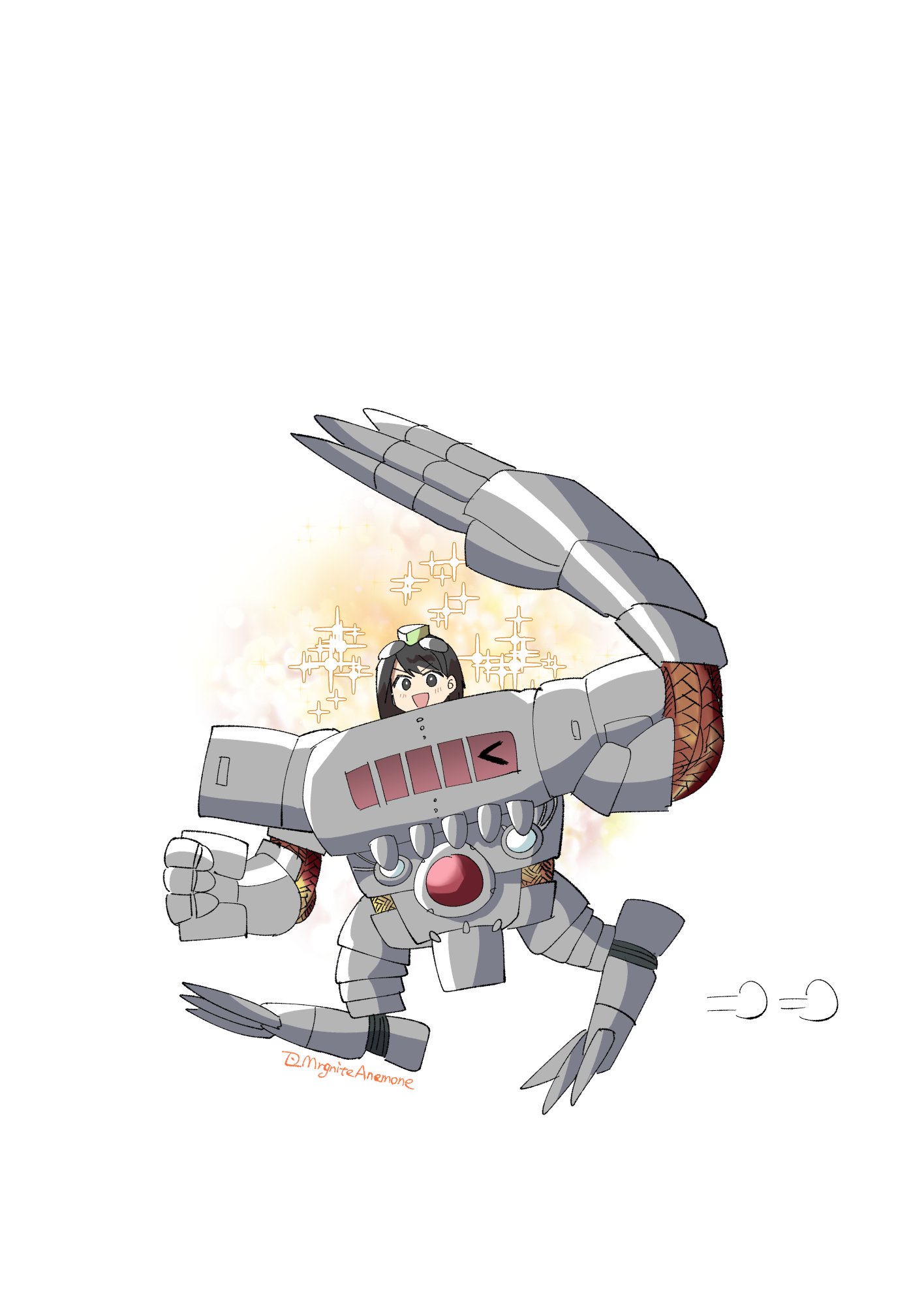 black_hair chibi digimon digimon_(creature) digimon_story:_time_stranger full_body goggles goggles_on_head highres mechanorimon mrgniteanemone riding robot simple_background white_background yuuki_kanan