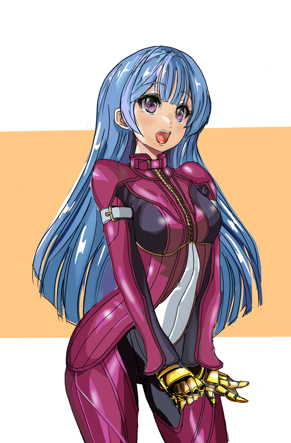 1girl bodysuit breasts commentary cowboy_shot final_fantasy final_fantasy_xv highres huo_ji_wu kula_diamond long_hair open_mouth pink_eyes purple_bodysuit purple_hair small_breasts solo standing the_king_of_fighters the_king_of_fighters_xiv v_arms