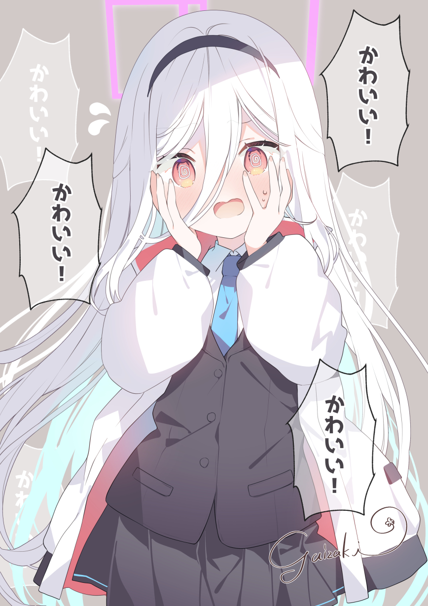 1girl @_@ black_hairband black_vest blue_archive blue_necktie blush collared_shirt commentary_request flying_sweatdrops grey_background grey_skirt hairband halo hands_on_own_face hands_up highres jacket kei_(blue_archive) kei_(new_body)_(blue_archive) long_hair long_sleeves looking_at_viewer necktie open_clothes open_jacket open_mouth pleated_skirt puffy_long_sleeves puffy_sleeves red_eyes shirt signature simple_background skirt solo sweat translation_request very_long_hair vest white_jacket white_shirt yuizaki_kazuya