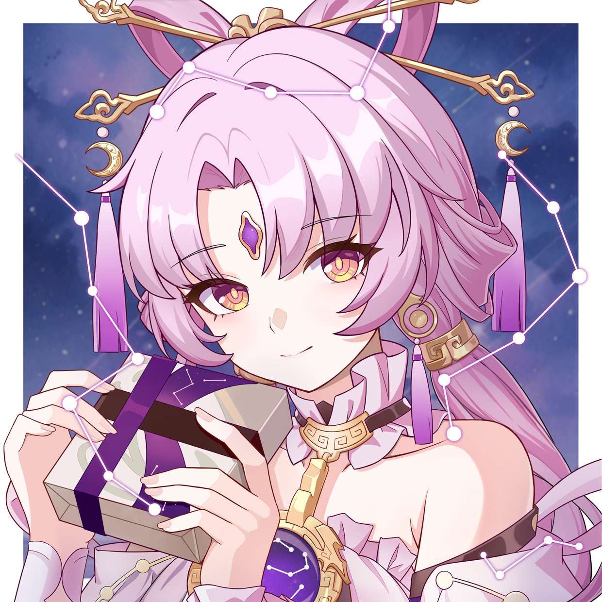 1girl bare_shoulders box chinese_commentary closed_mouth commentary_request dress forehead_jewel fu_xuan_(honkai:_star_rail) gift gift_box hair_ornament hair_rings hair_stick hasana highres holding holding_gift honkai:_star_rail honkai_(series) long_hair looking_at_viewer low_twintails orange_eyes parted_bangs pink_hair smile solo tassel twintails upper_body yellow_eyes